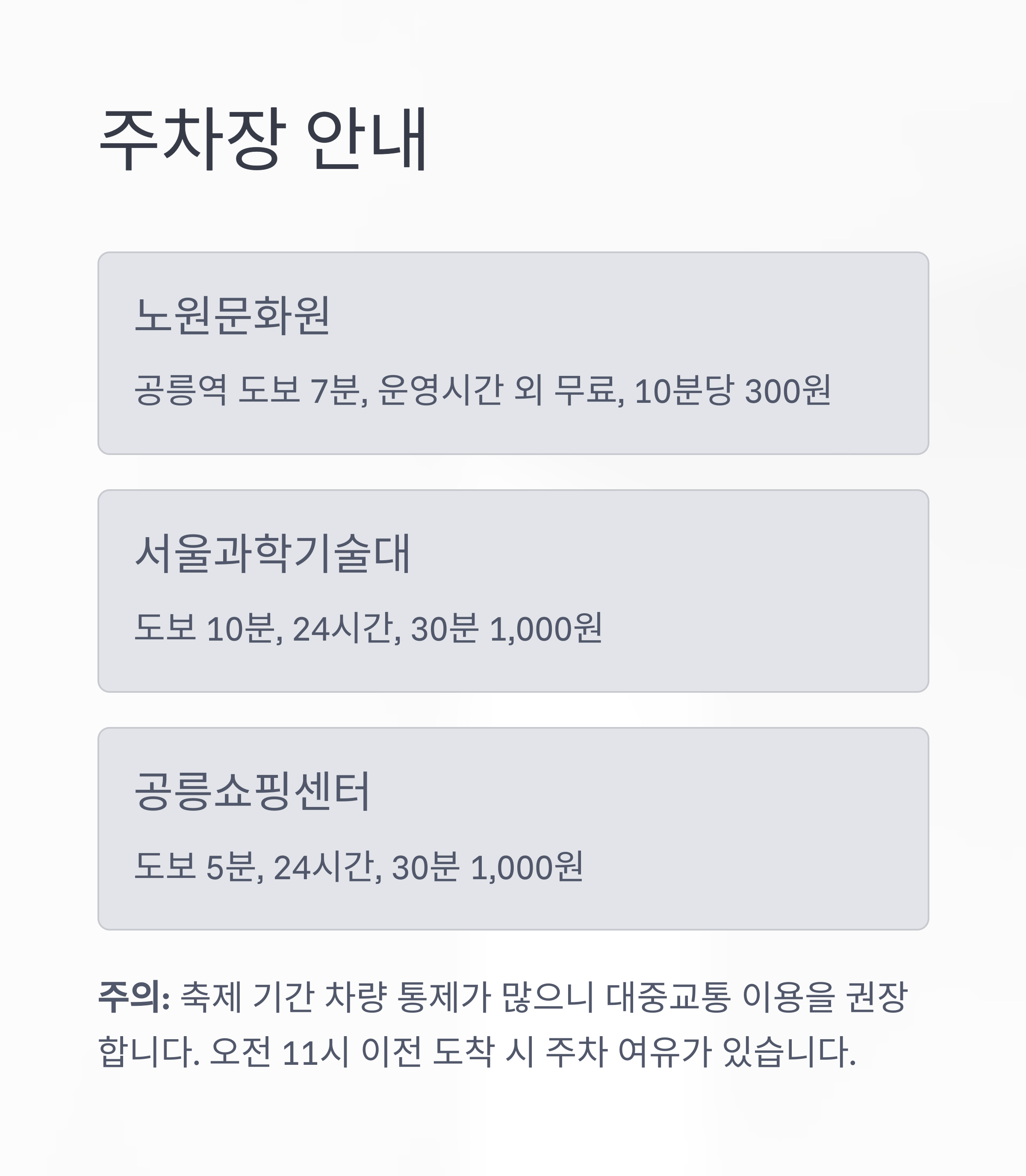 현장 팁: 축제 기간에는 오전 11시 이전 도착 시 주차 여유, 이후에는 만차 및 대기 발생 가능. 노원문화원 주차장은 운영시간 외 무료 개방, 서울과기대·공릉쇼핑센터 등은 24시간 운영으로 비교적 접근성이 좋습니다. 불법주정차 단속이 엄격하니 반드시 공식 주차장만 이용하세요.