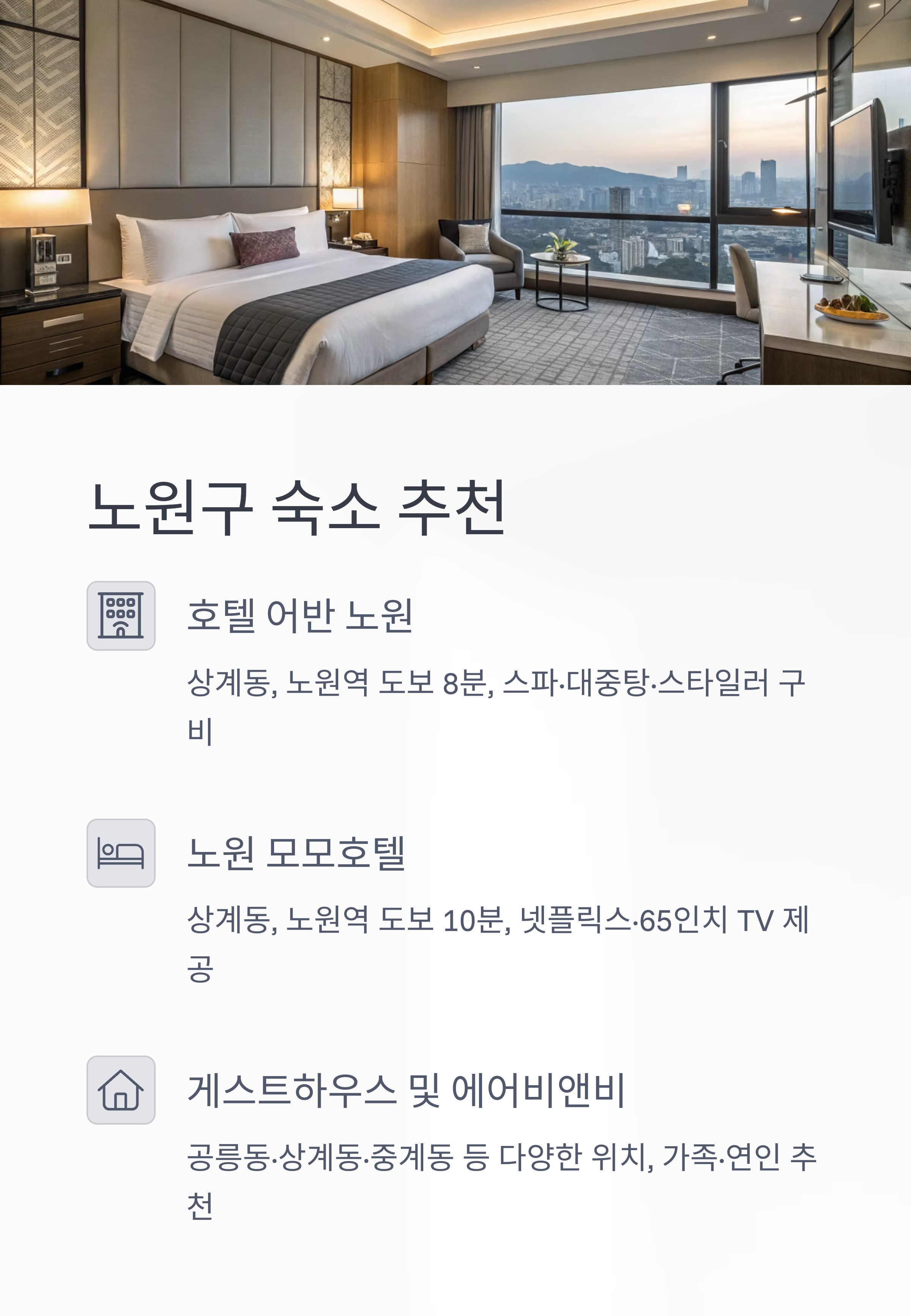 노원구 숙소는 역세권·공원 인근·상업지구 등 다양한 입지와 가격대가 있으며, 축제 기간에는 조기 마감될 수 있으니 미리 예약하는 것이 좋습니다. 각 숙소는 무료 또는 인근 공영주차장 이용이 가능합니다. 실제 투숙객 평점이 높은 곳은 청결, 조용함, 넓은 객실, 편리한 주차 등이 공통적으로 언급됩니다.