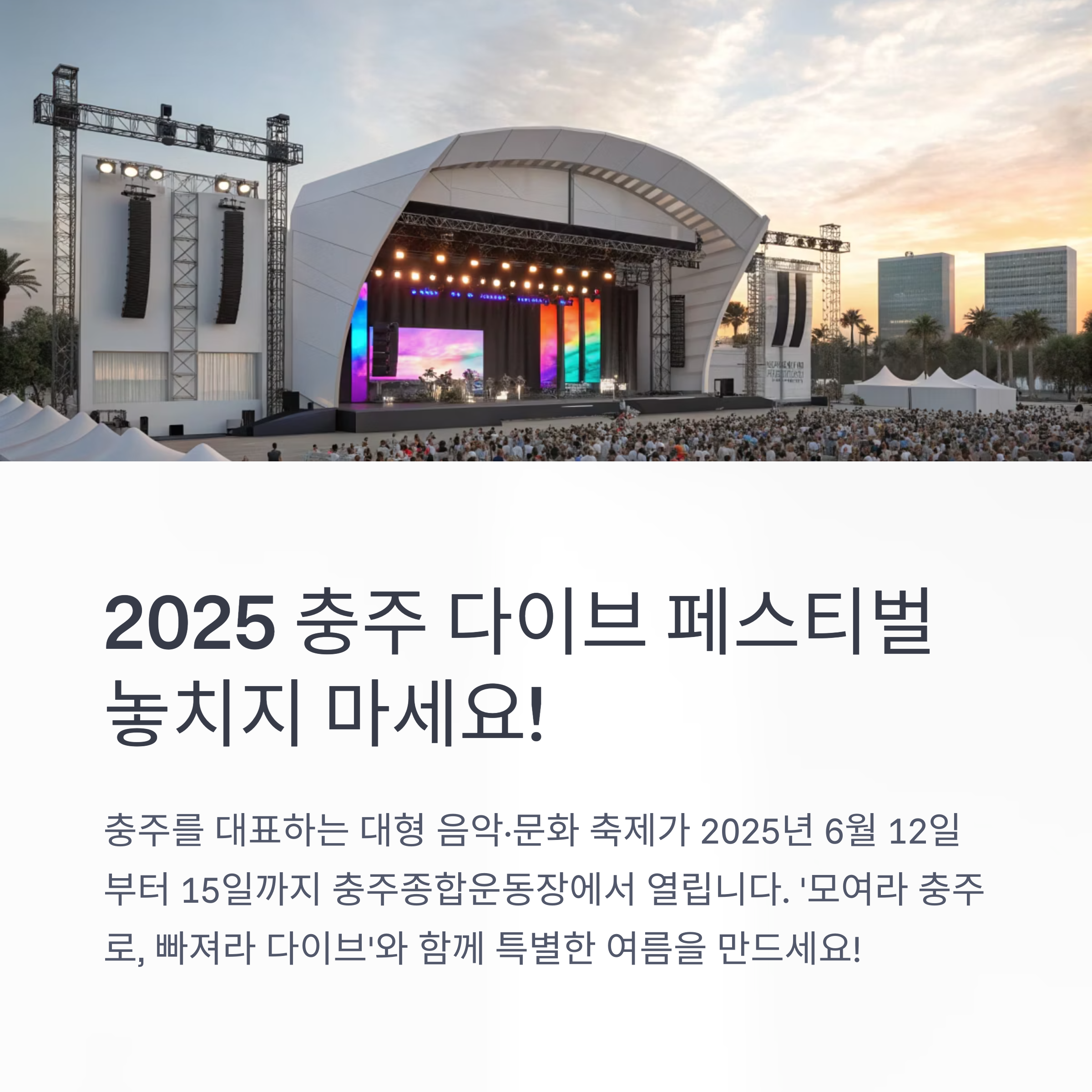 충주를 대표하는 대형 음악·문화 축제 2025 충주 다이브 페스티벌이 2025년 6월 12일(목)부터 6월 15일(일)까지 4일간 충주종합운동장(충청북도 충주시 대림로 85) 일원에서 개최됩니다. 올해 주제는 ‘모여라 충주로, 빠져라 다이브’로, 다양한 장르의 인기 아티스트와 시민참여형 공연, 체험, 마켓, 먹거리, 불꽃놀이 등 남녀노소 모두가 즐길 수 있는 프로그램이 준비되어 있습니다. 전체 일정, 프로그램, 참가 방법 등은 아래 바로가기를 통해 확인하세요.