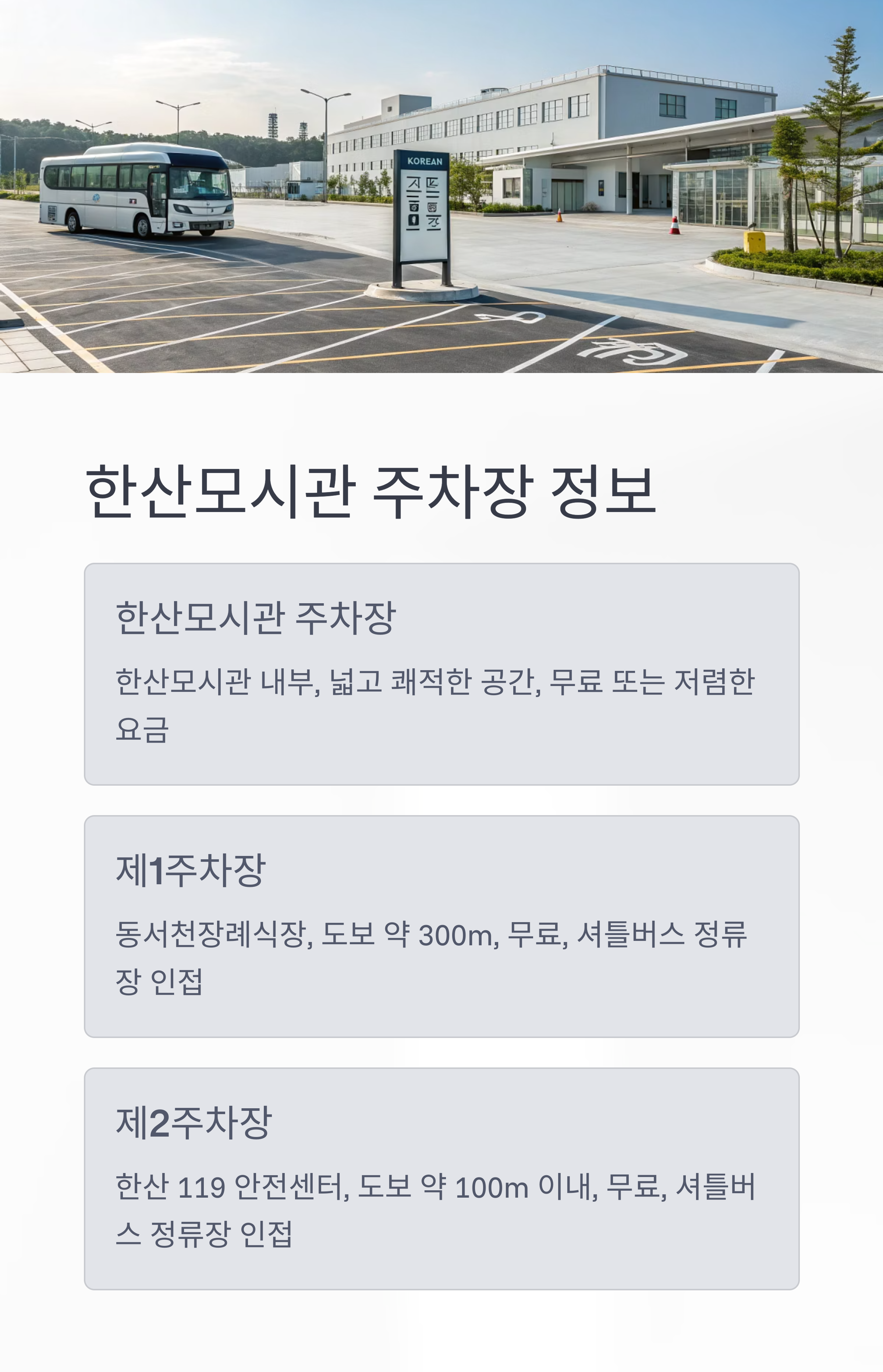 - 동서천장례식장 주차장(제1주차장): 한산모시관에서 도보 약 300m, 무료, 셔틀버스 정류장 인접