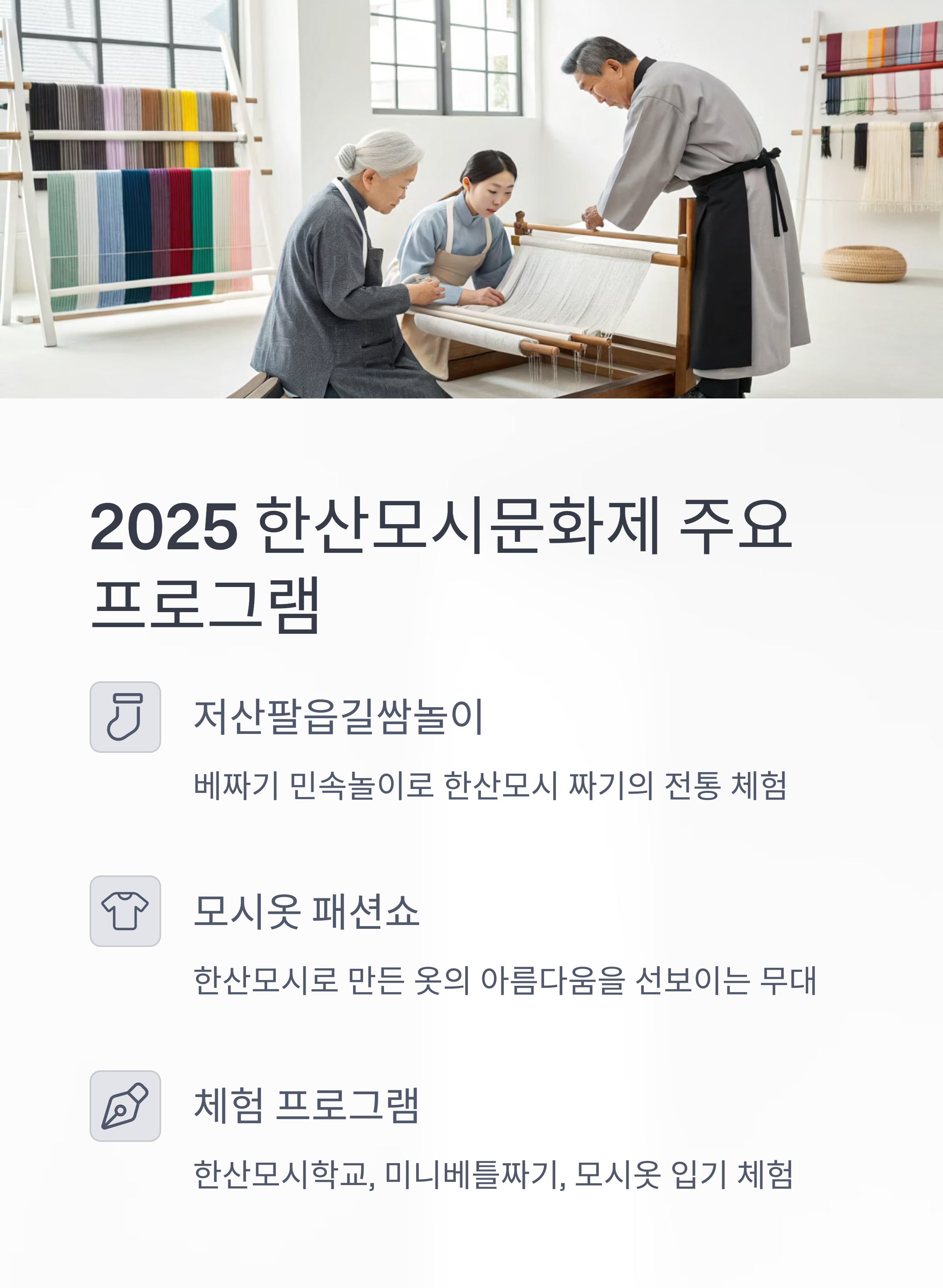 - 저산팔읍길쌈놀이, 모시옷 패션쇼, 미니베틀짜기 등 주요 프로그램 시간표를 미리 확인하고 동선을 짜두면 더욱 알차게 즐길 수 있습니다.