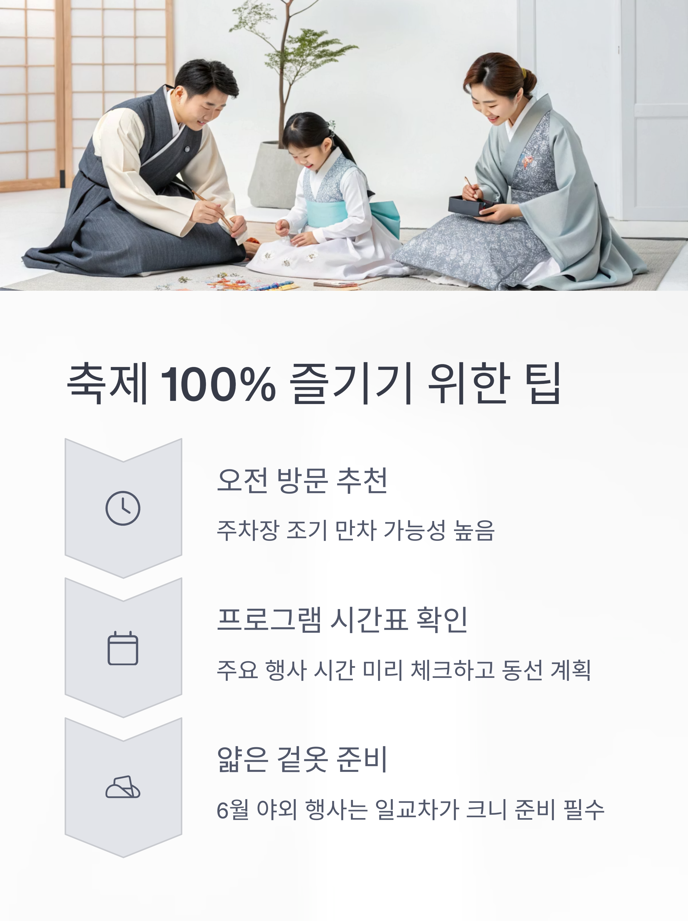 - 6월 야외 행사는 일교차가 크니, 얇은 겉옷을 챙기면 좋습니다.