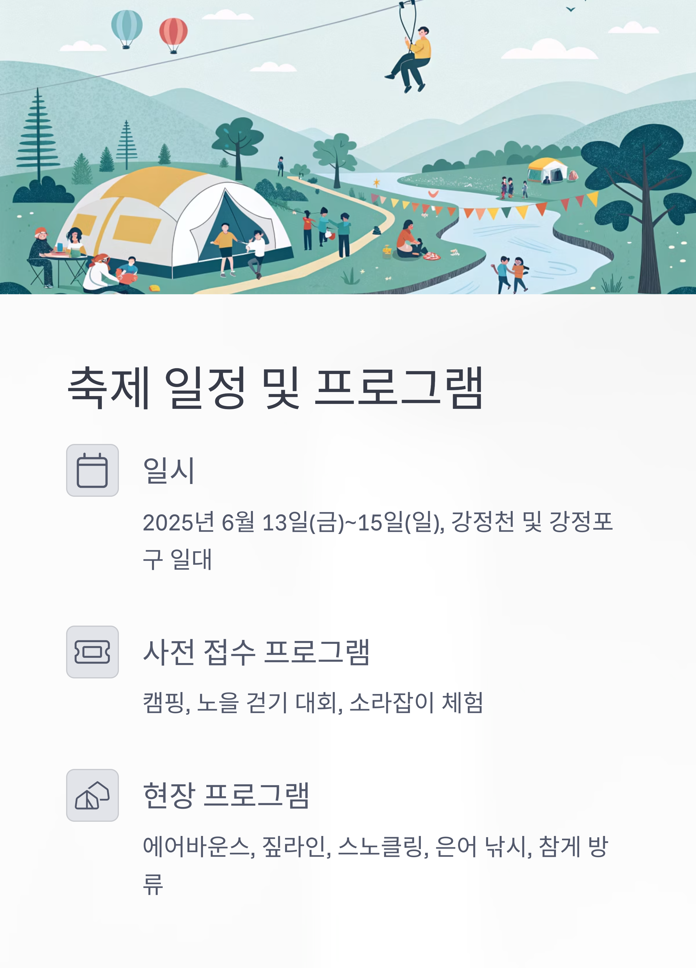 - 키즈 에어바운스, 계곡 짚라인, 스노클링, 플리마켓 등 다양한 체험과 부대행사도 꼭 즐겨보세요.