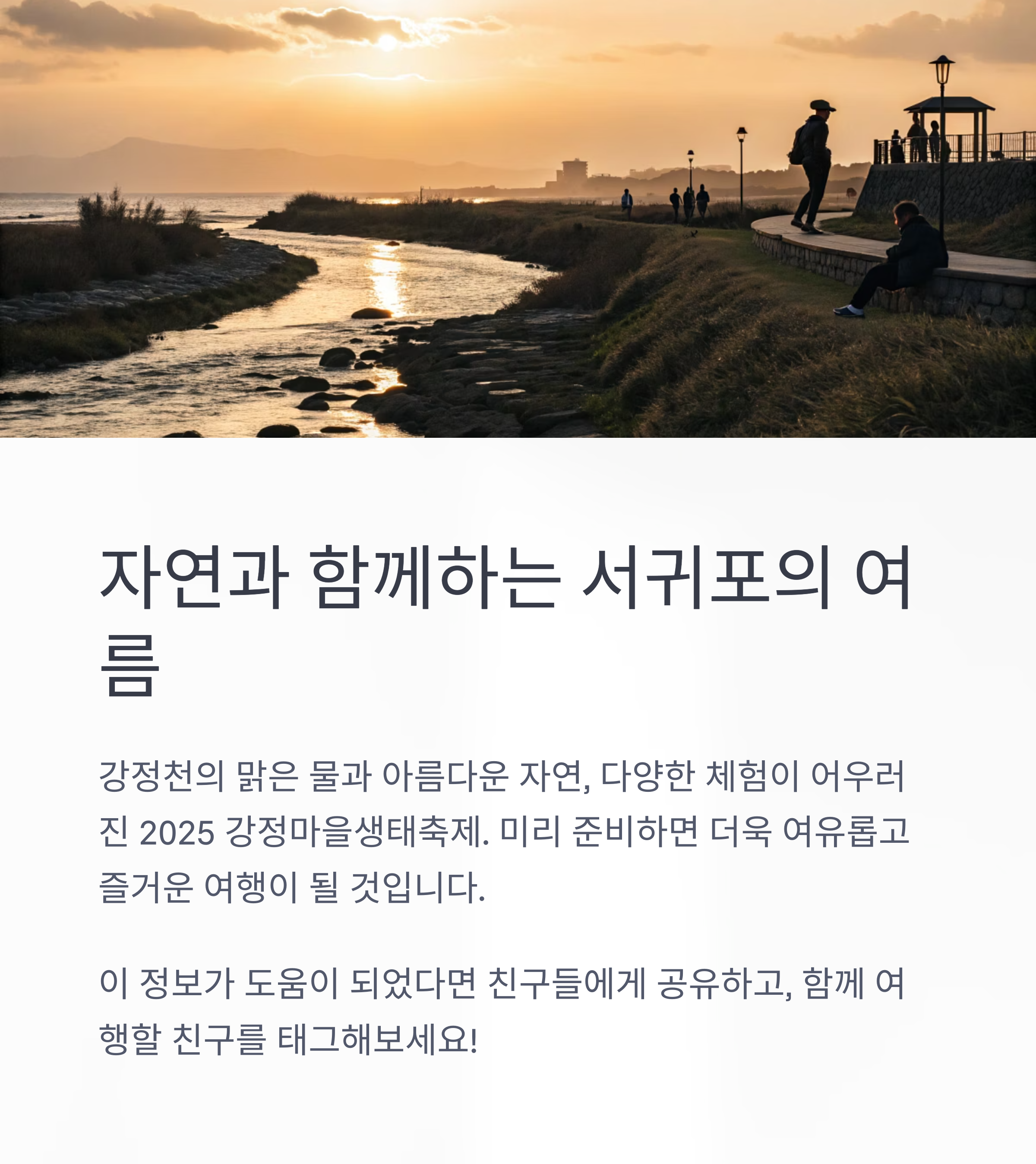 2025 강정마을생태축제는 강정천의 맑은 물과 아름다운 자연, 다양한 체험과 공연이 어우러진 서귀포의 대표 생태축제입니다. 강정마을 주차장, 다양한 서귀포 숙소까지 미리 준비하면 더욱 여유롭고 즐거운 여행이 될 것입니다. 공식 정보와 예약 사이트는 본문 내 버튼을 통해 확인하고, 완벽한 서귀포 여름 여행을 계획해보세요!