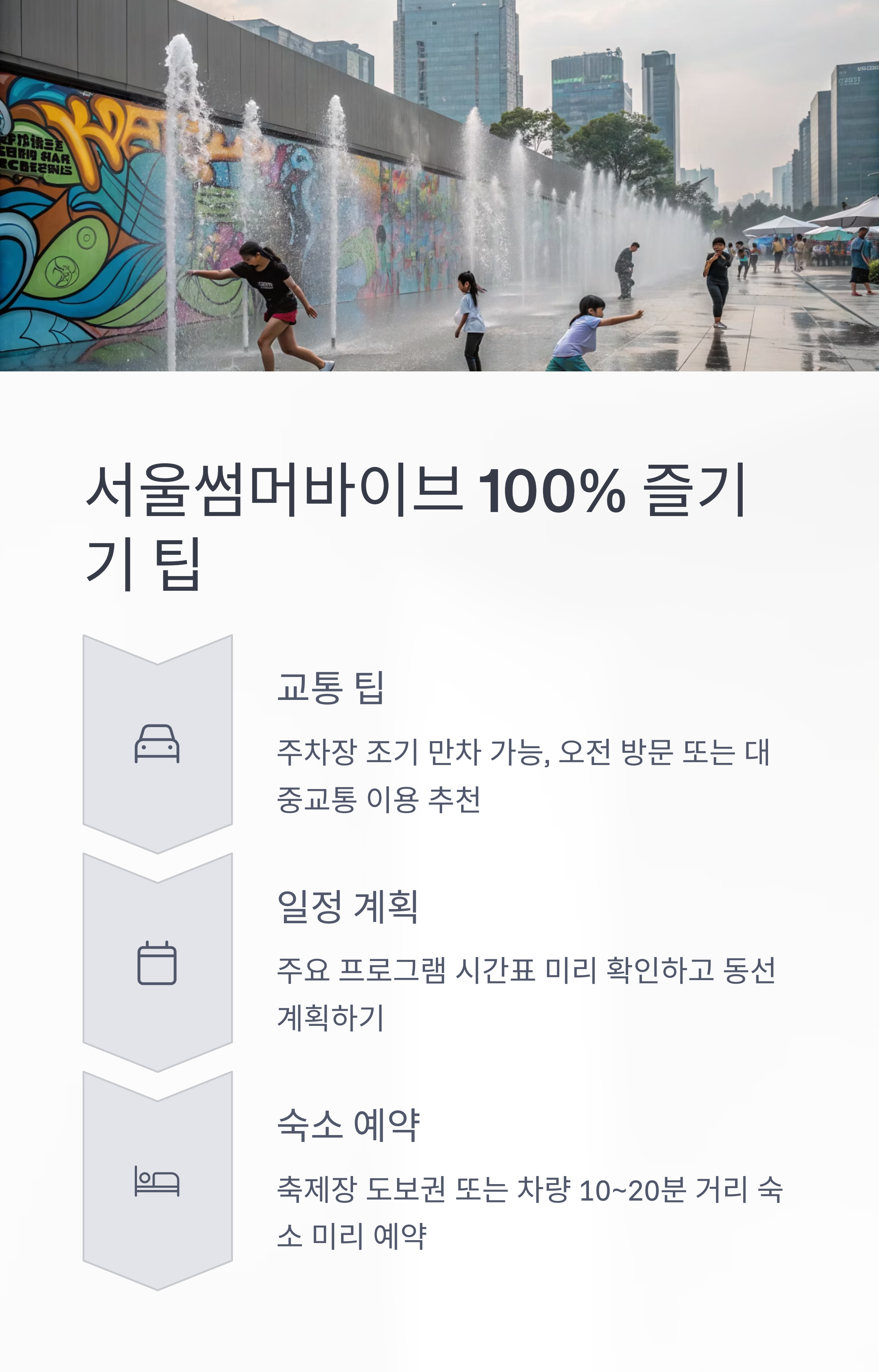 2025 서울썸머바이브는 스트리트 감성과 여름의 열기가 어우러진 서울 대표 여름축제입니다. 서울숲 주차장, 다양한 서울 숙소까지 미리 준비하면 더욱 여유롭고 즐거운 여행이 될 것입니다. 공식 정보와 예약 사이트는 본문 내 버튼을 통해 확인하고, 완벽한 서울 여름 나들이를 계획해보세요!