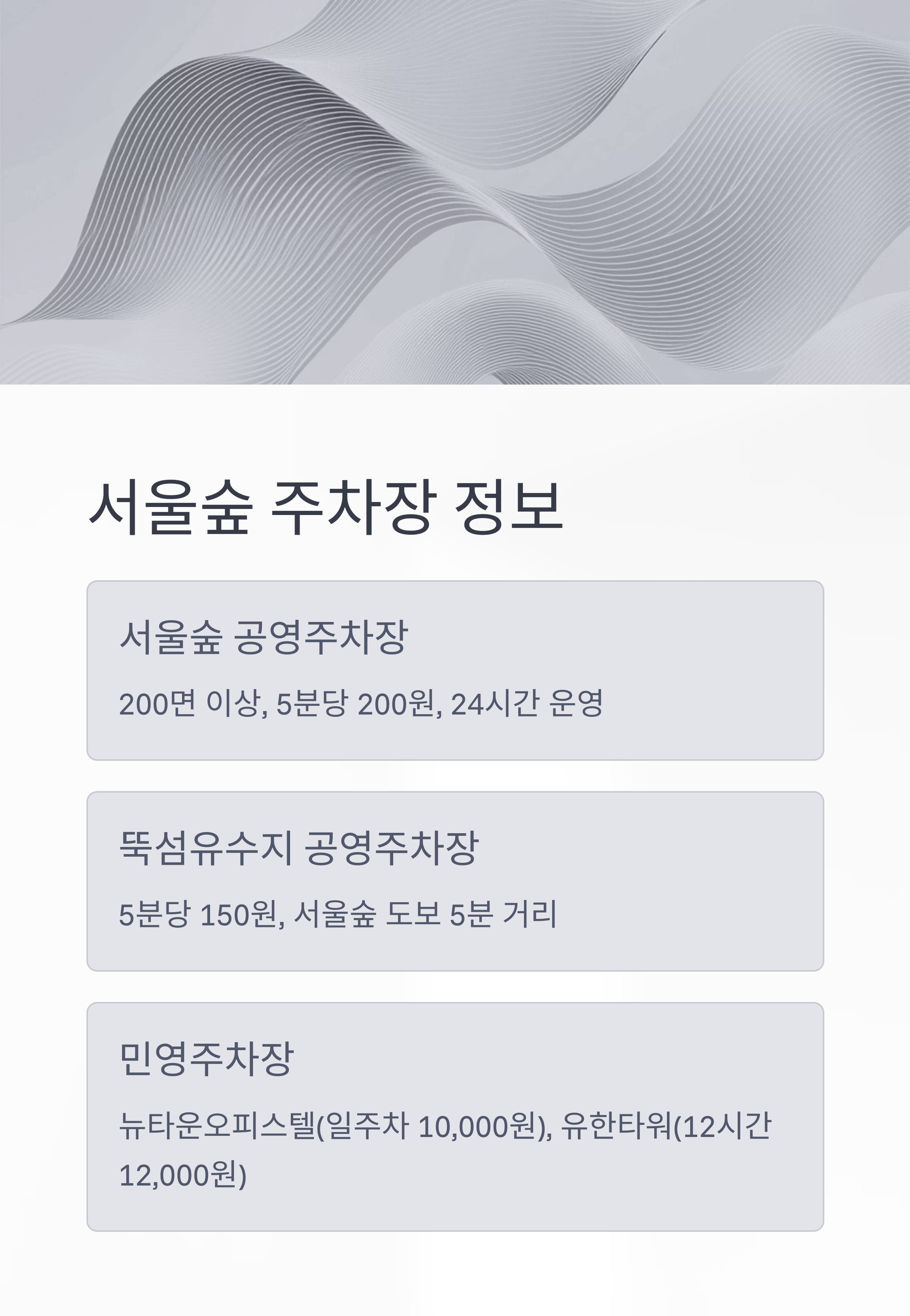 - 서울숲 공영주차장: 서울 성동구 뚝섬로 273, 200면 이상, 5분당 200원(1시간 2,400원), 24시간 운영, 장애인·경차 할인