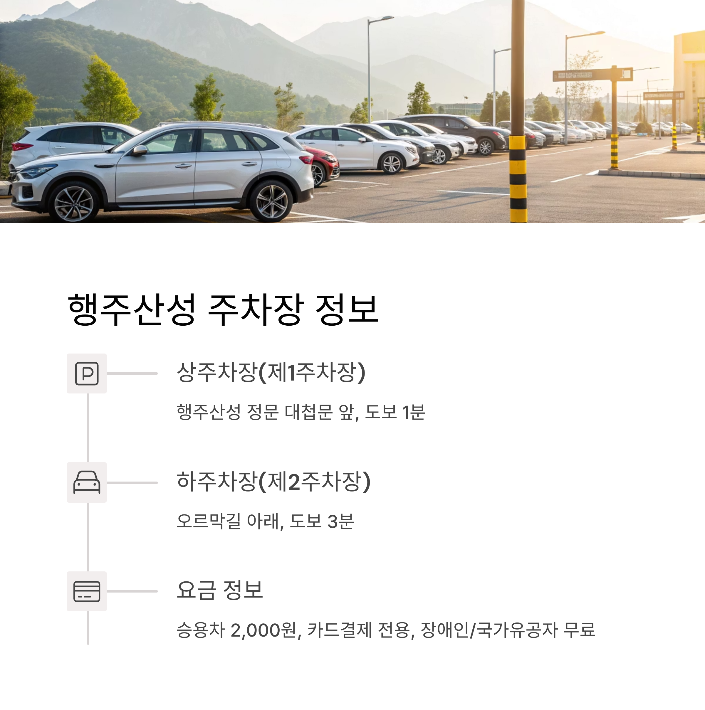 행주산성에는 2곳의 공영주차장이 마련되어 있습니다. 대표적인 주차장은 다음과 같습니다[4][5][11].