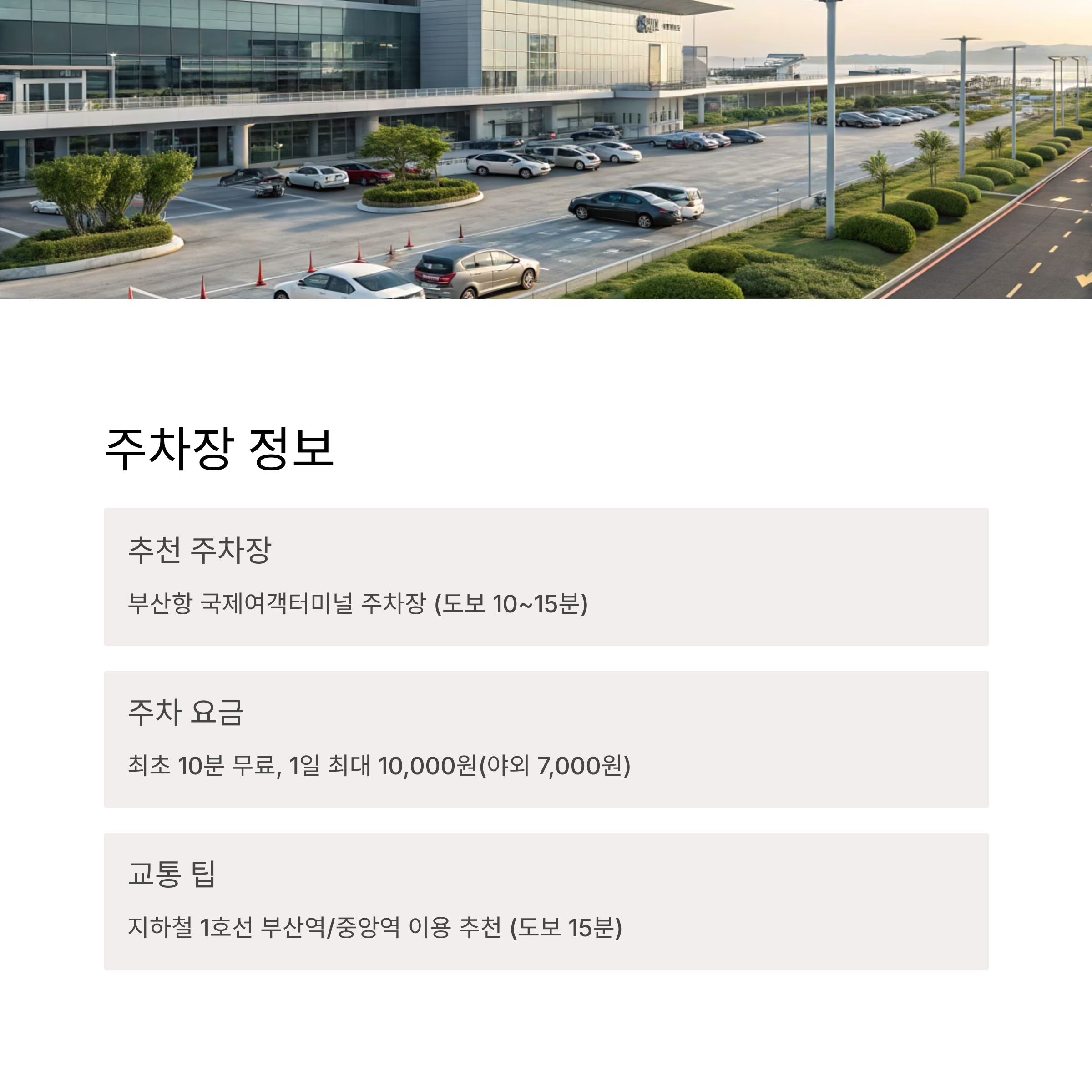 - 부산항 국제여객터미널 주차장: 부산광역시 동구 충장대로 206, 실내·야외 주차장 모두 운영, 1부두에서 도보 약 10~15분 거리