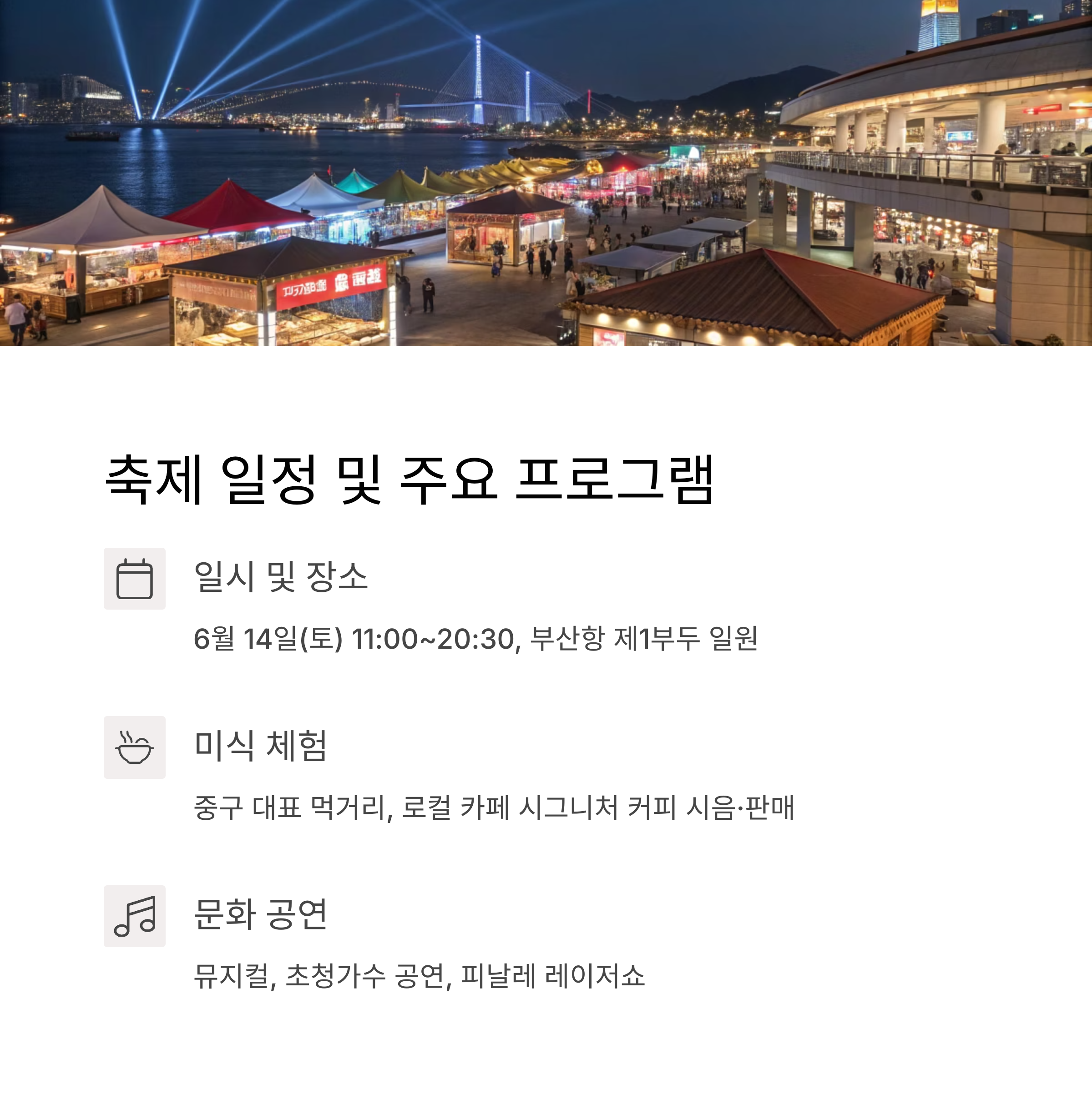 - 중구 대표 먹거리, 로컬 카페, 공연, 레이저쇼 등 주요 프로그램 시간표를 미리 확인하고 동선을 짜두면 더욱 알차게 즐길 수 있습니다.