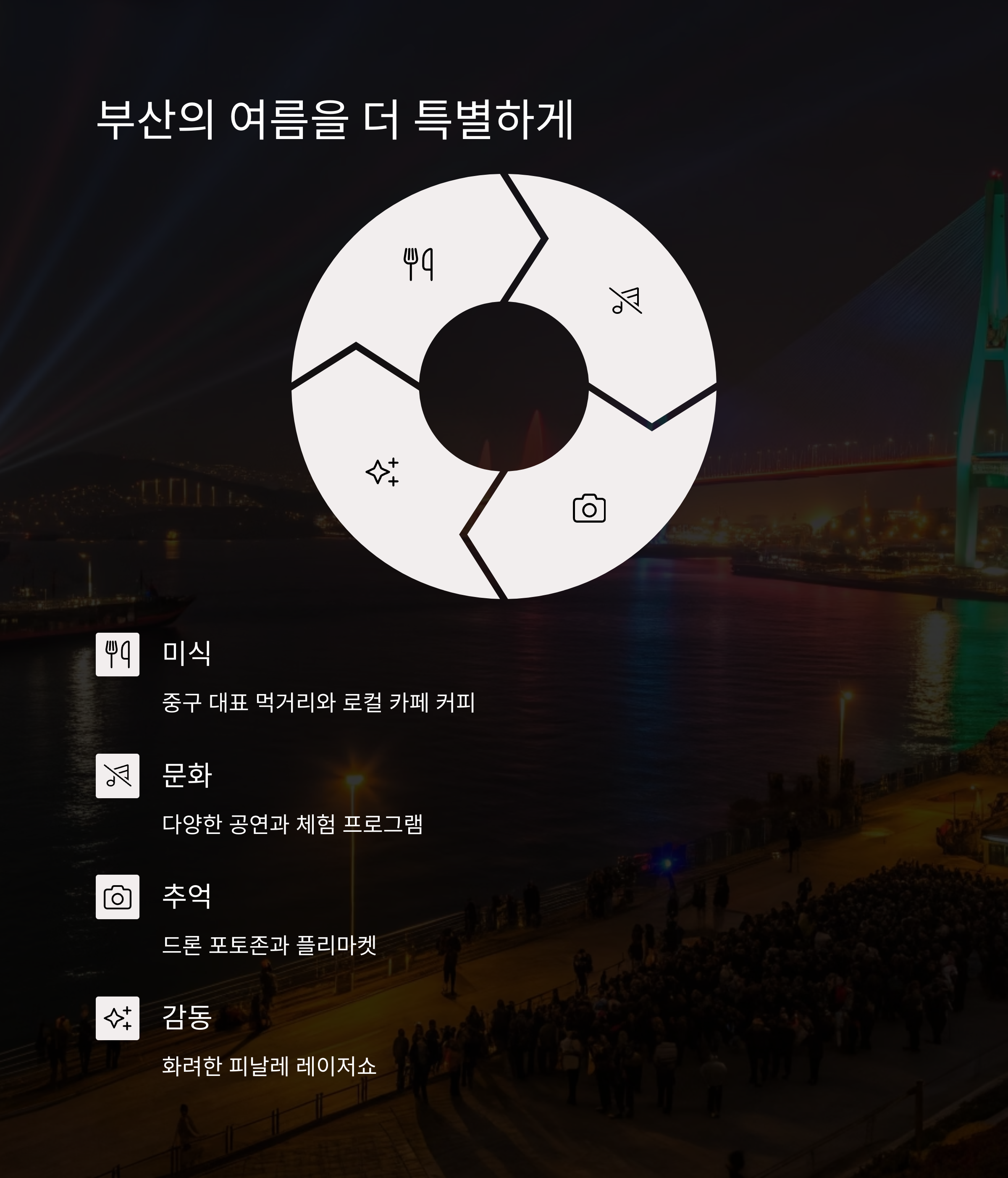 부산항 제1부두의 역사적 가치와 중구의 역동성, 미래지향성을 체감할 수 있는 축제로, 다양한 먹거리와 공연, 체험, 레이저쇼까지 하루 종일 즐길 수 있습니다.