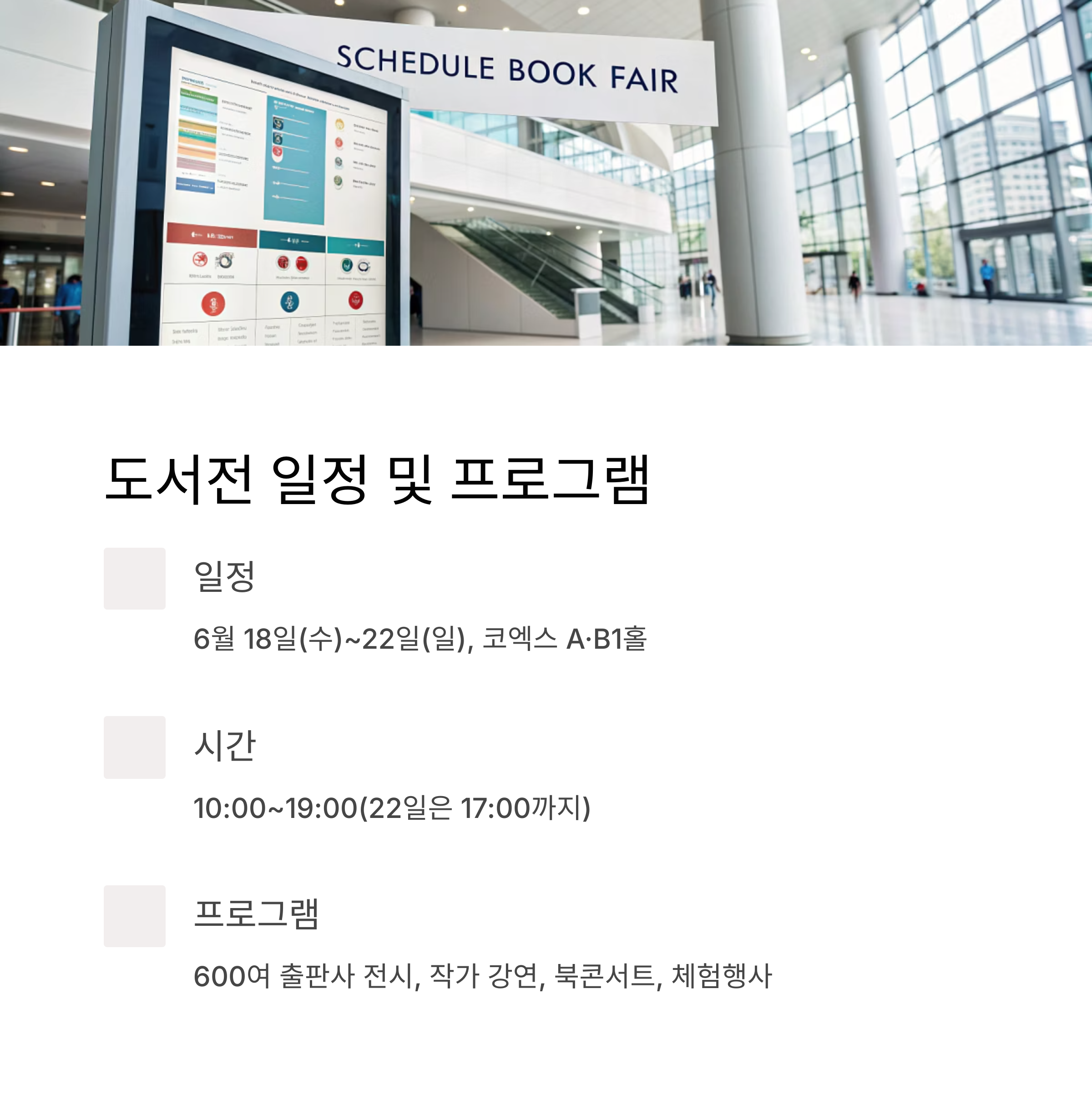 - 주요 강연, 북토크, 체험 프로그램 일정을 미리 확인하고 동선을 짜두면 더욱 알차게 즐길 수 있습니다.