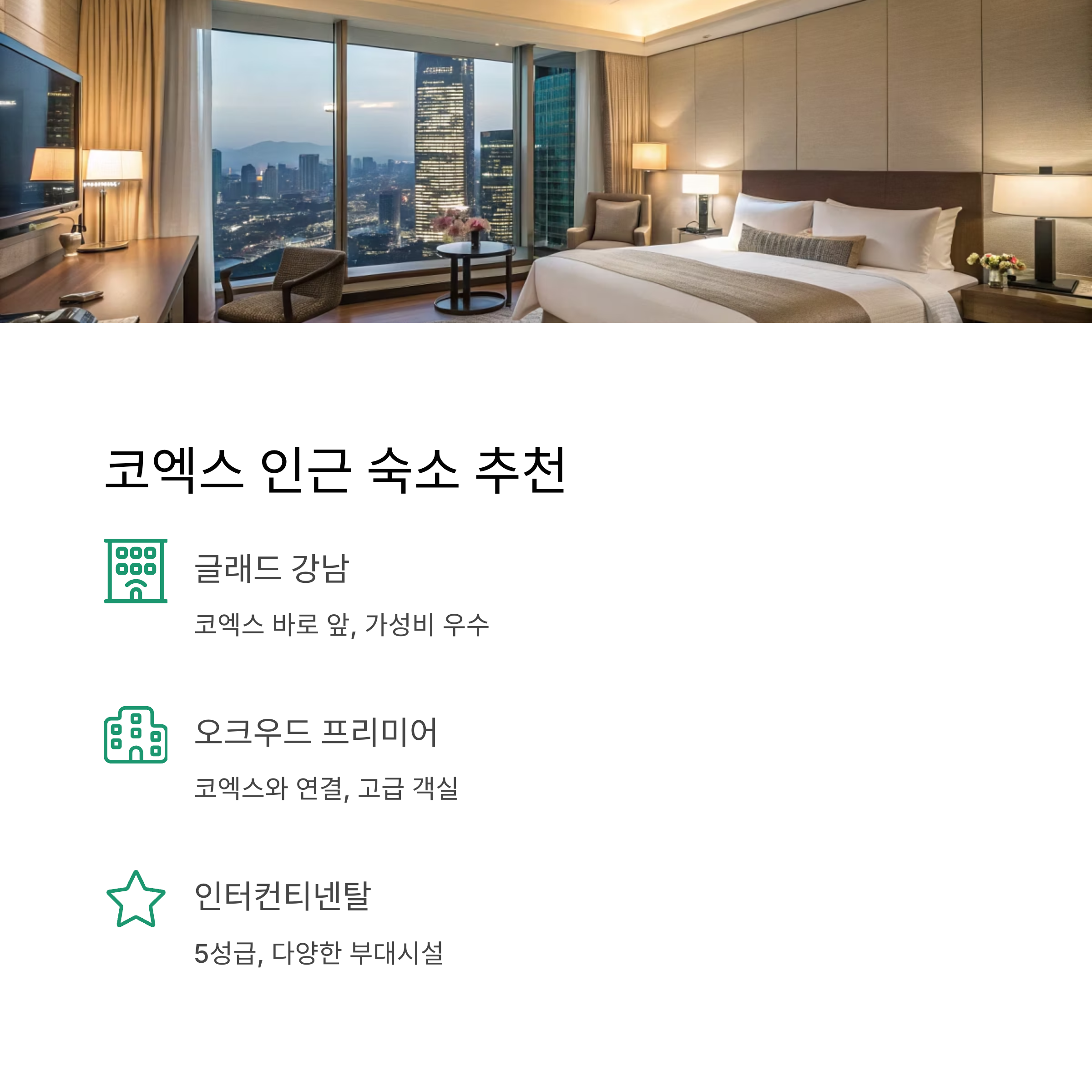 - 글래드 강남 코엑스센터: 삼성역 1번 출구 도보 1분, 코엑스 바로 앞, 가성비 우수, 가족·비즈니스 모두 추천