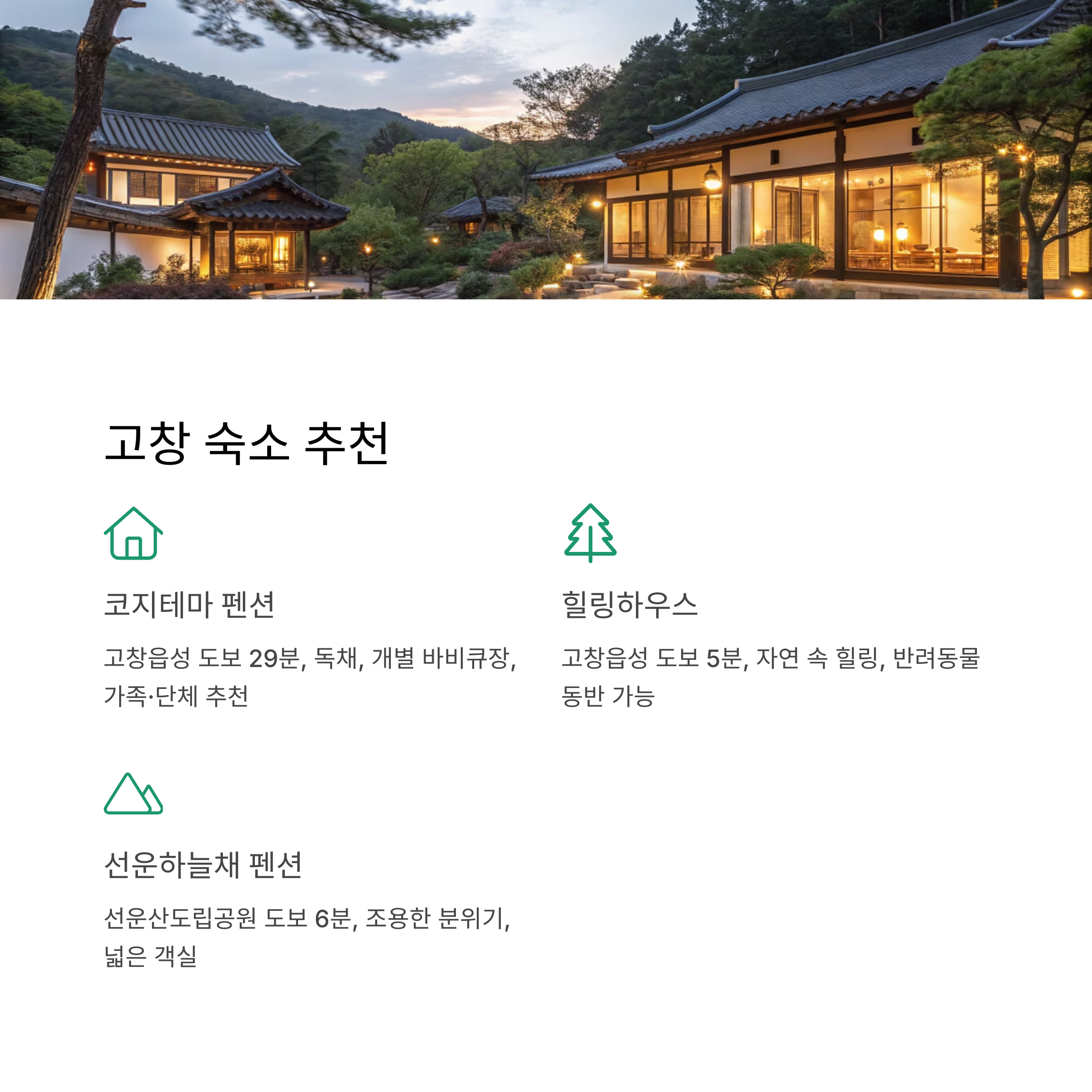 - 고창 에어비앤비: 가족형, 감성 독채, 오션뷰, 반려동물 동반 등 다양한 옵션