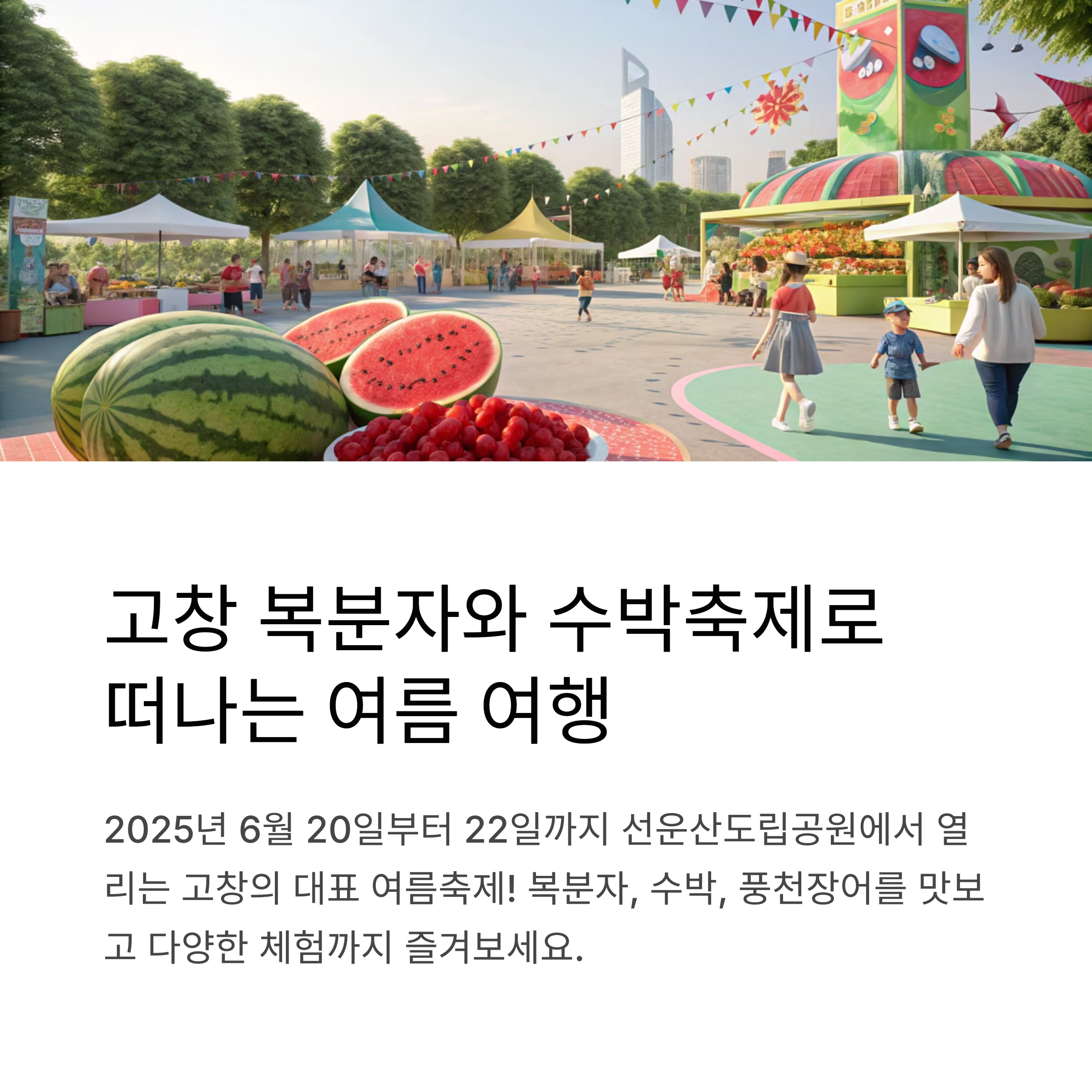 2025 고창 복분자와 수박축제는 신선한 농특산물과 다양한 체험, 공연, 먹거리가 어우러진 고창의 대표 여름축제입니다. 고창군청 주차장, 다양한 고창 숙소까지 미리 준비하면 더욱 여유롭고 즐거운 여행이 될 것입니다. 공식 정보와 예약 사이트는 본문 내 버튼을 통해 확인하고, 완벽한 고창 여름나들이를 계획해보세요!