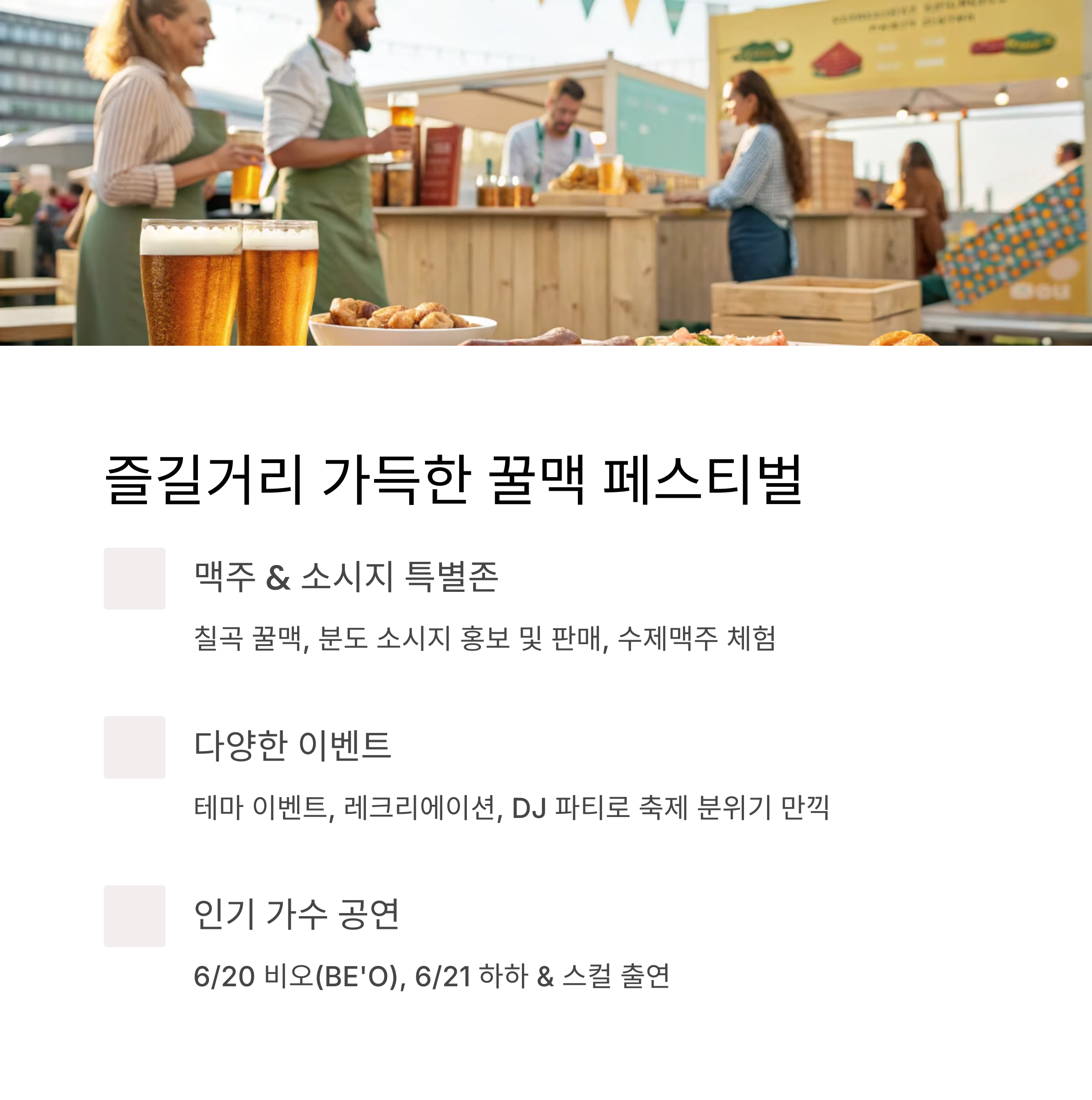- 인기 체험(맥주 & 소시지 테마 이벤트, 레크리에이션 등)은 현장 선착순 마감 가능성이 있으니 미리 일정을 확인하세요.