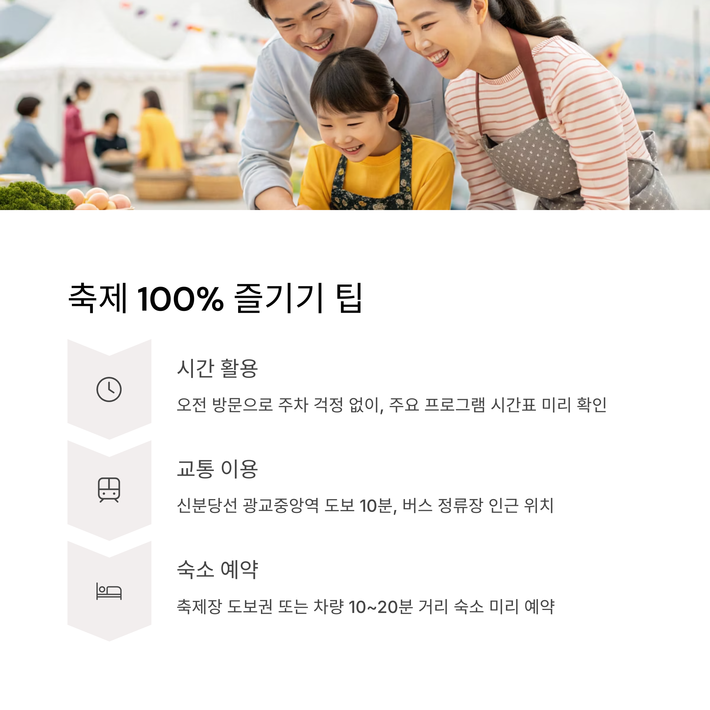 - 주차장은 행사 기간 조기 만차될 수 있으니 오전 방문 또는 대중교통(신분당선 광교중앙역 도보 10분, 버스 정류장 인근) 이용을 추천합니다.