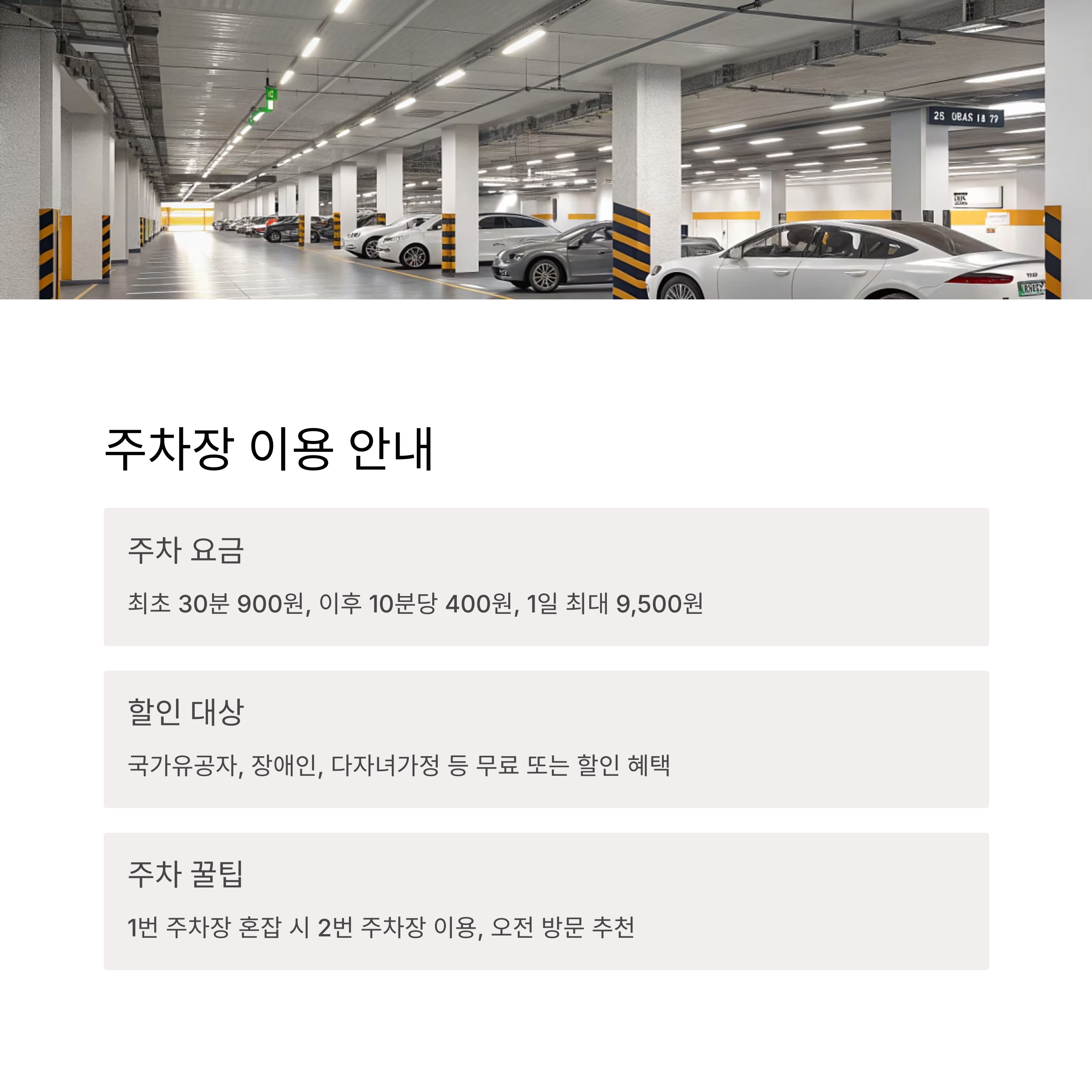 - 주차 요금: 최초 30분 900원, 이후 10분당 400원, 1일 최대 9,500원(카드 결제 전용)