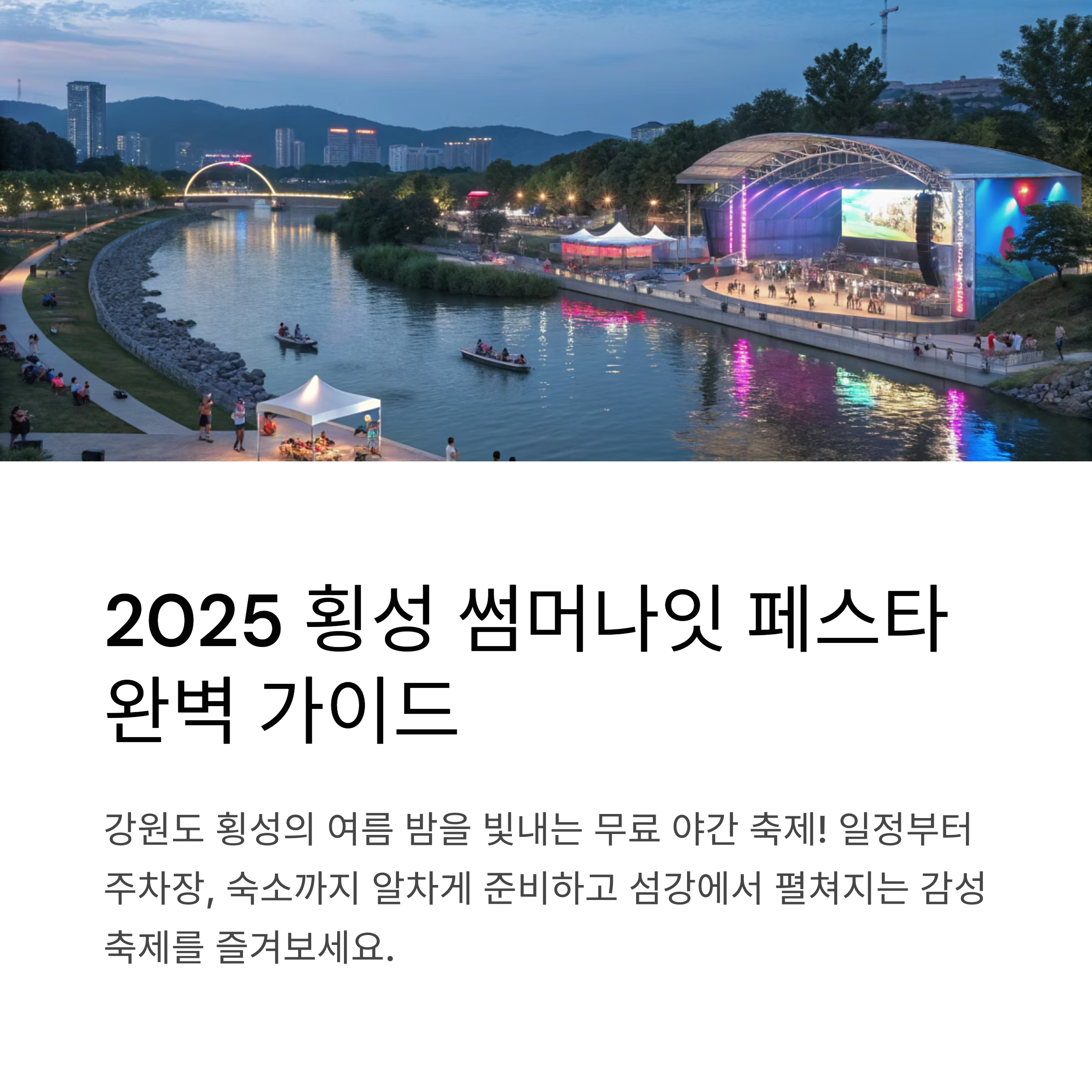 2025 횡성 썸머나잇 페스타는 섬강의 맑은 물과 감성 라이브 콘서트, 시원한 물놀이, 다양한 체험과 먹거리가 어우러진 횡성의 대표 여름 축제입니다. 횡성문화체육공원 주차장, 다양한 횡성 숙소까지 미리 준비하면 더욱 여유롭고 즐거운 여행이 될 것입니다. 공식 정보와 예약 사이트는 본문 내 버튼을 통해 확인하고, 완벽한 횡성 여름밤 축제를 계획해보세요!