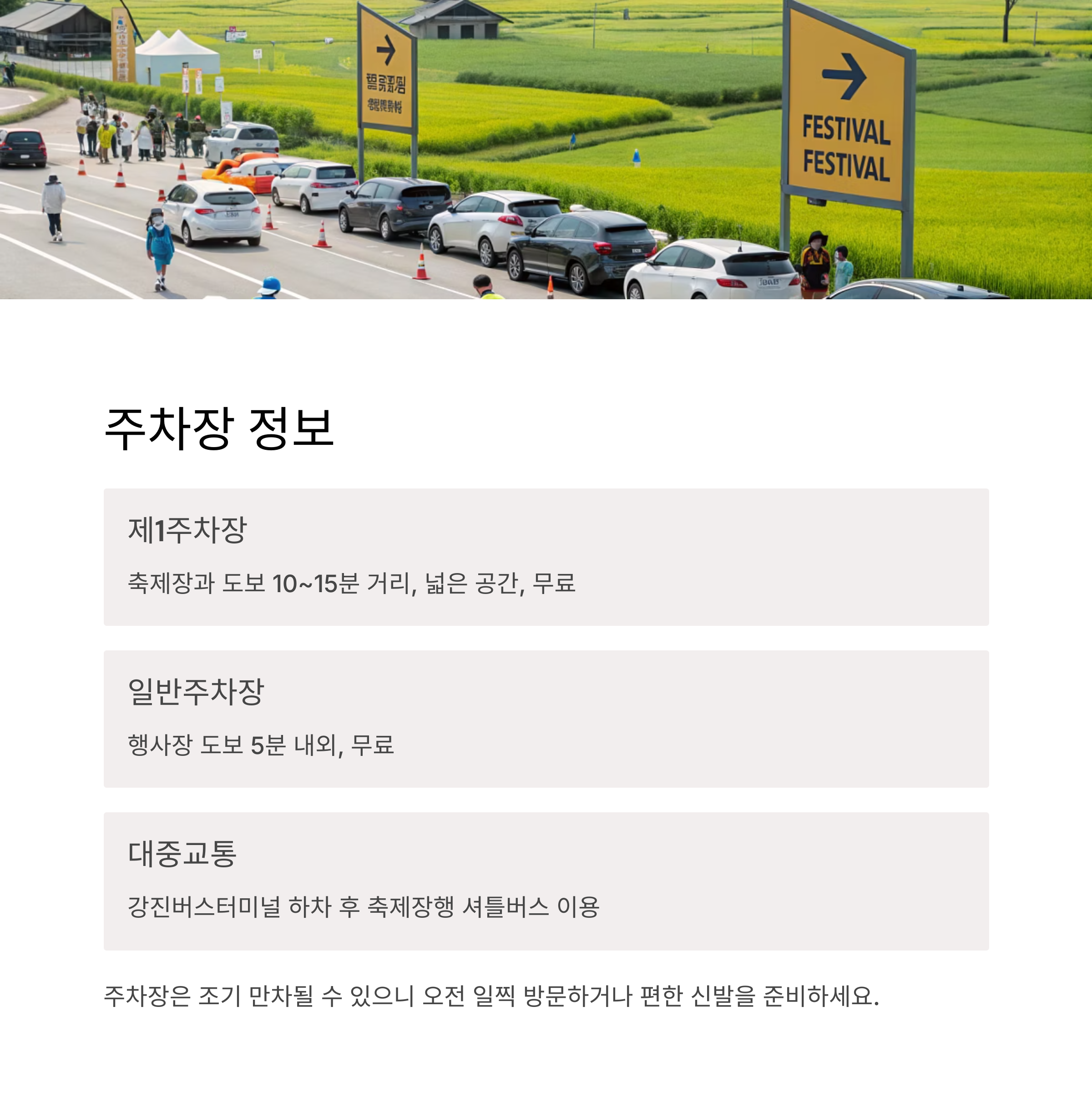 - 임시주차장: 축제장 주변 임시로 마련, 안내요원 배치