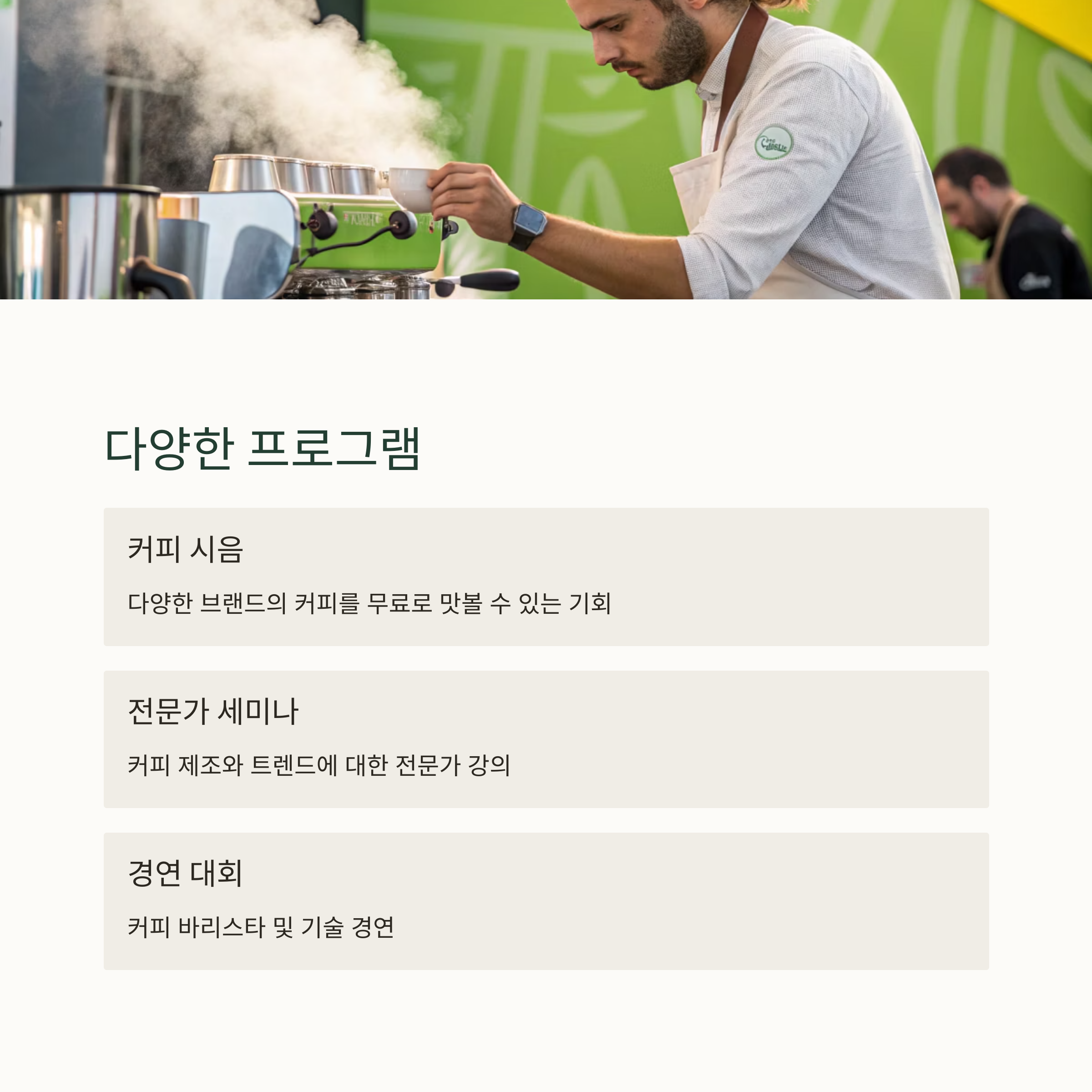 이번 행사는 50개 이상의 브랜드와 함께하여 다양한 커피 맛을 체험할 기회를 제공합니다.