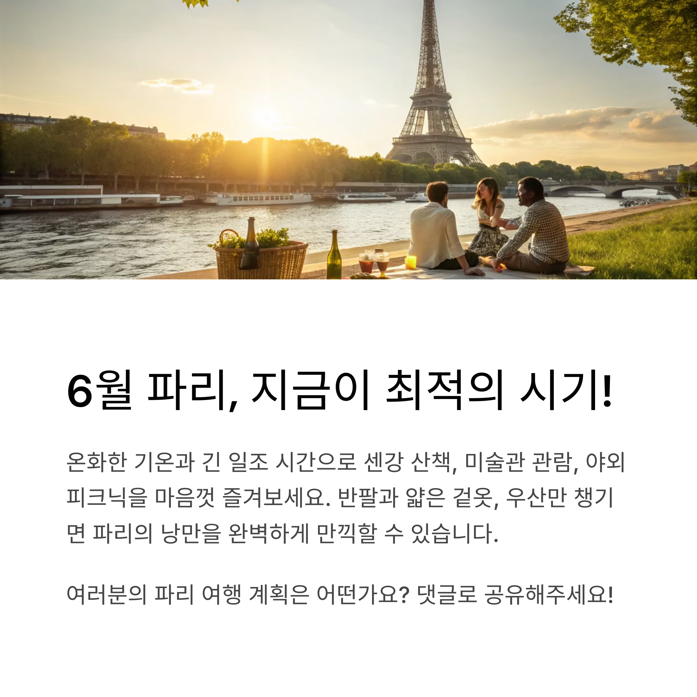 6월의 파리는 본격적인 여름의 시작과 함께 유럽 특유의 온화함을 자랑합니다. 낮에는 햇살이 강하고, 밤에는 선선해 여행하기에 최적의 시기입니다. 파리 여행을 준비하는 분들을 위해 6월 날씨, 인천-파리 직항 항공편 정보, 그리고 시내 인기 숙소를 한 번에 정리했습니다.