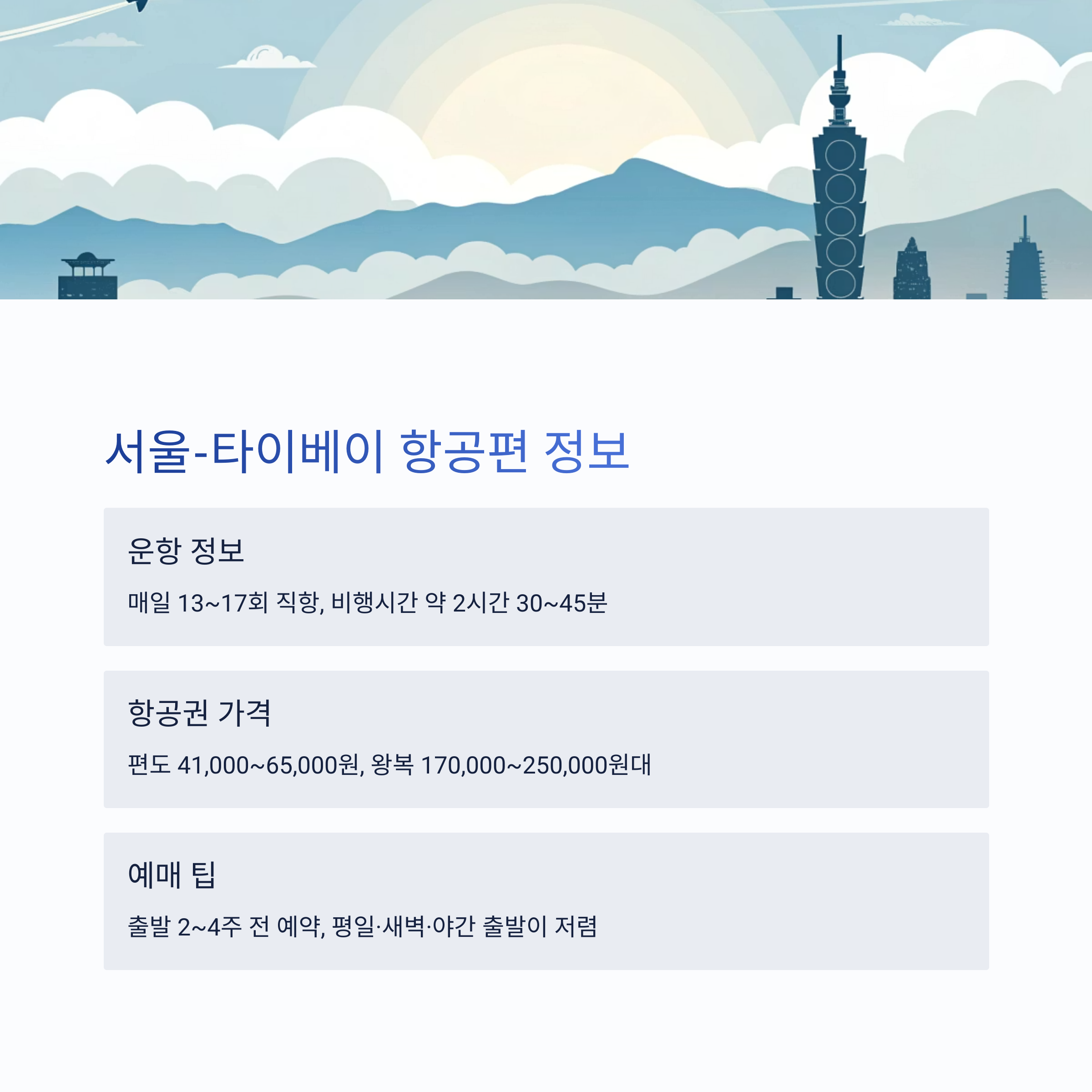 인천, 김포 등에서 타이베이(타오위안·쑹산)로 가는 직항편은 대한항공, 에바항공, 중화항공, 이스타항공, 제주항공, 진에어, 티웨이항공, 스쿠트 등 다양한 항공사가 매일 13~17회 운항합니다. 평균 비행시간은 2시간 30~45분입니다.