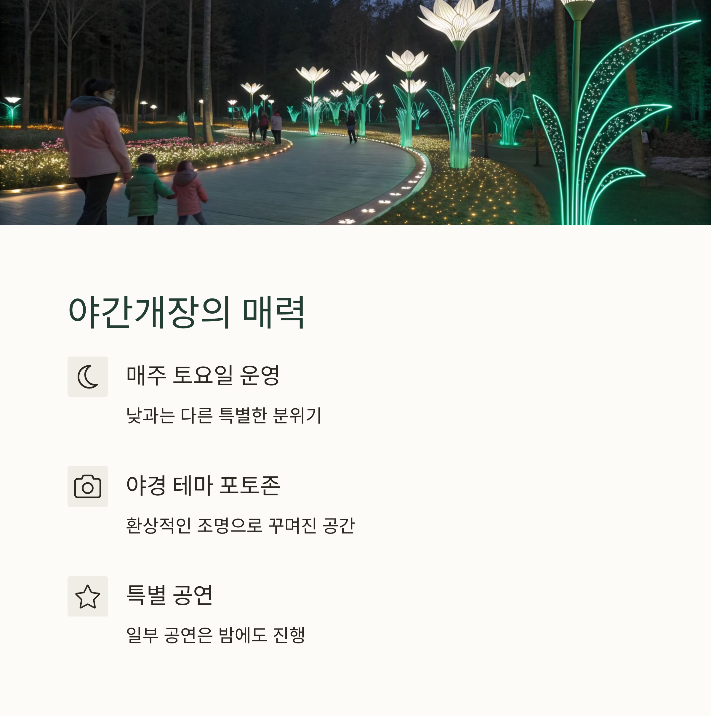 | 야간개장 시, 낮과는 색다른 분위기의 체험을 제공합니다. 야경 테마를 활용한 특별한 포토존을 중심으로 운영됩니다. 4월 공연 일정과 연계되어 일부 공연은 밤에도 즐길 수 있는 경우가 있습니다. 자연 생태 관찰을 위한 특수 조명 또는 장비가 구비될 수도 있습니다. 야간 티켓 정보는 공식 홈페이지 또는 현장에서 반드시 사전에 확인하셔야 합니다. |