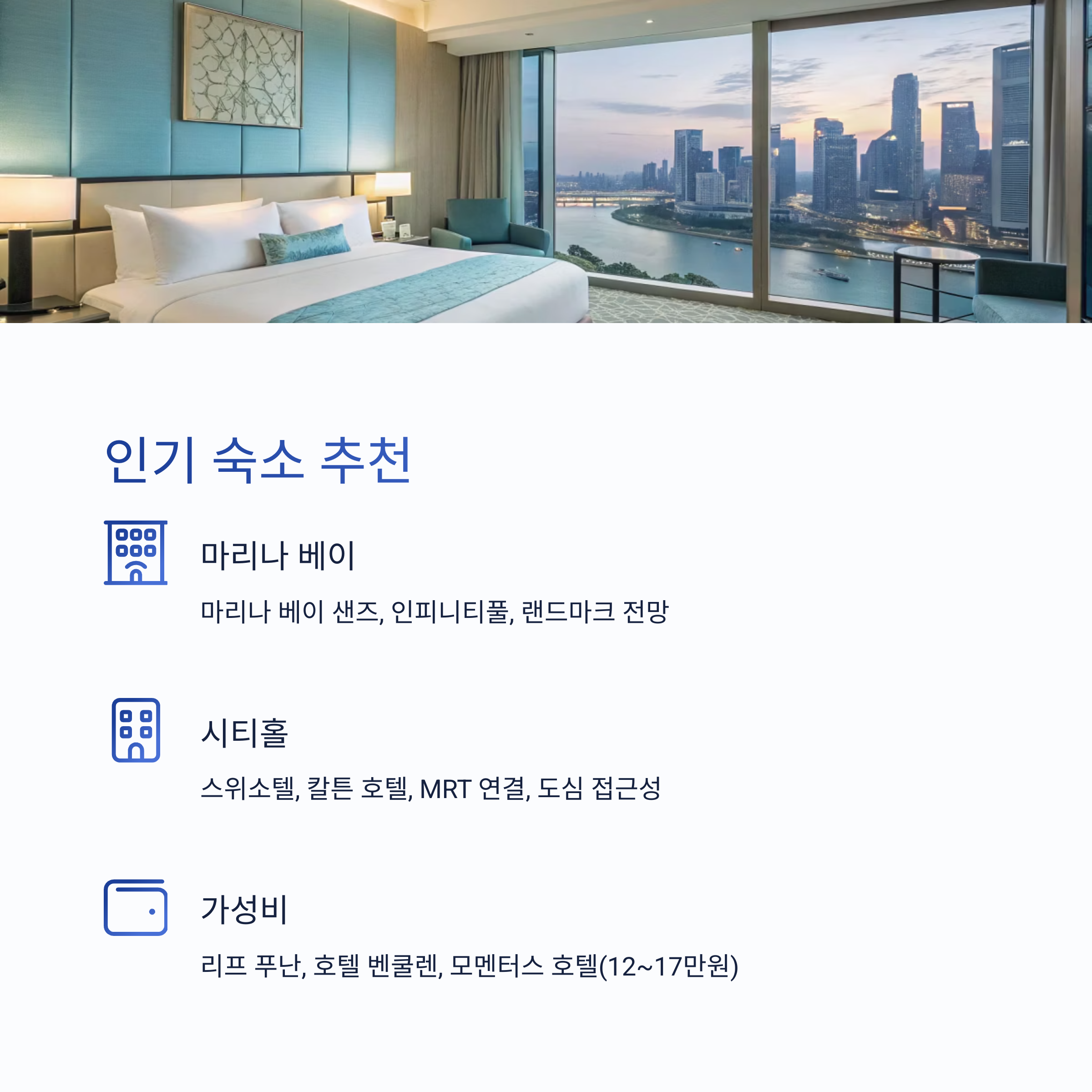 싱가포르의 대표 숙소 지역은 마리나 베이, 시티홀, 클락키, 차이나타운, 오차드로드 등입니다. 고급 호텔부터 가성비 호텔, 가족·커플 여행에 적합한 곳까지 다양하게 선택할 수 있습니다. 최근 후기와 위치, 시설 모두 좋은 인기 숙소를 소개합니다.