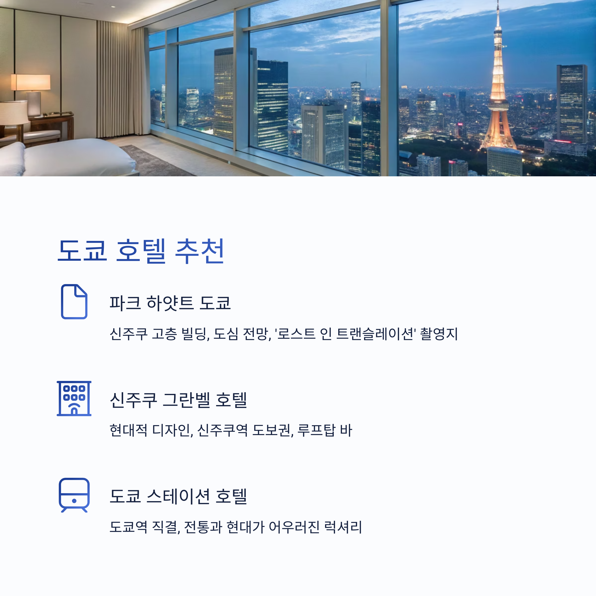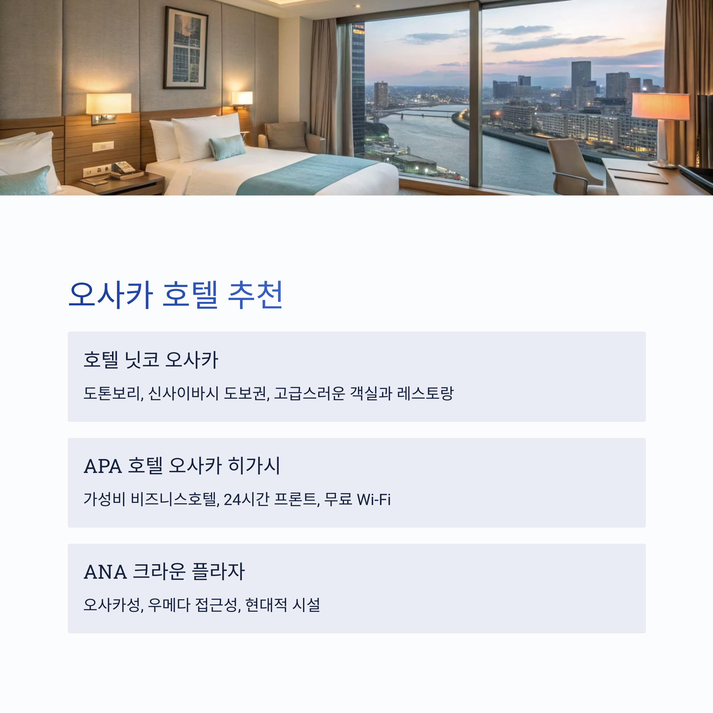 일본은 도쿄, 오사카, 교토, 후쿠오카 등 주요 도시마다 특색 있는 호텔과 비즈니스호텔, 료칸, 게스트하우스가 다양합니다. 예산과 여행 스타일에 맞는 숙소를 미리 예약하면 더욱 쾌적한 여행이 가능합니다.