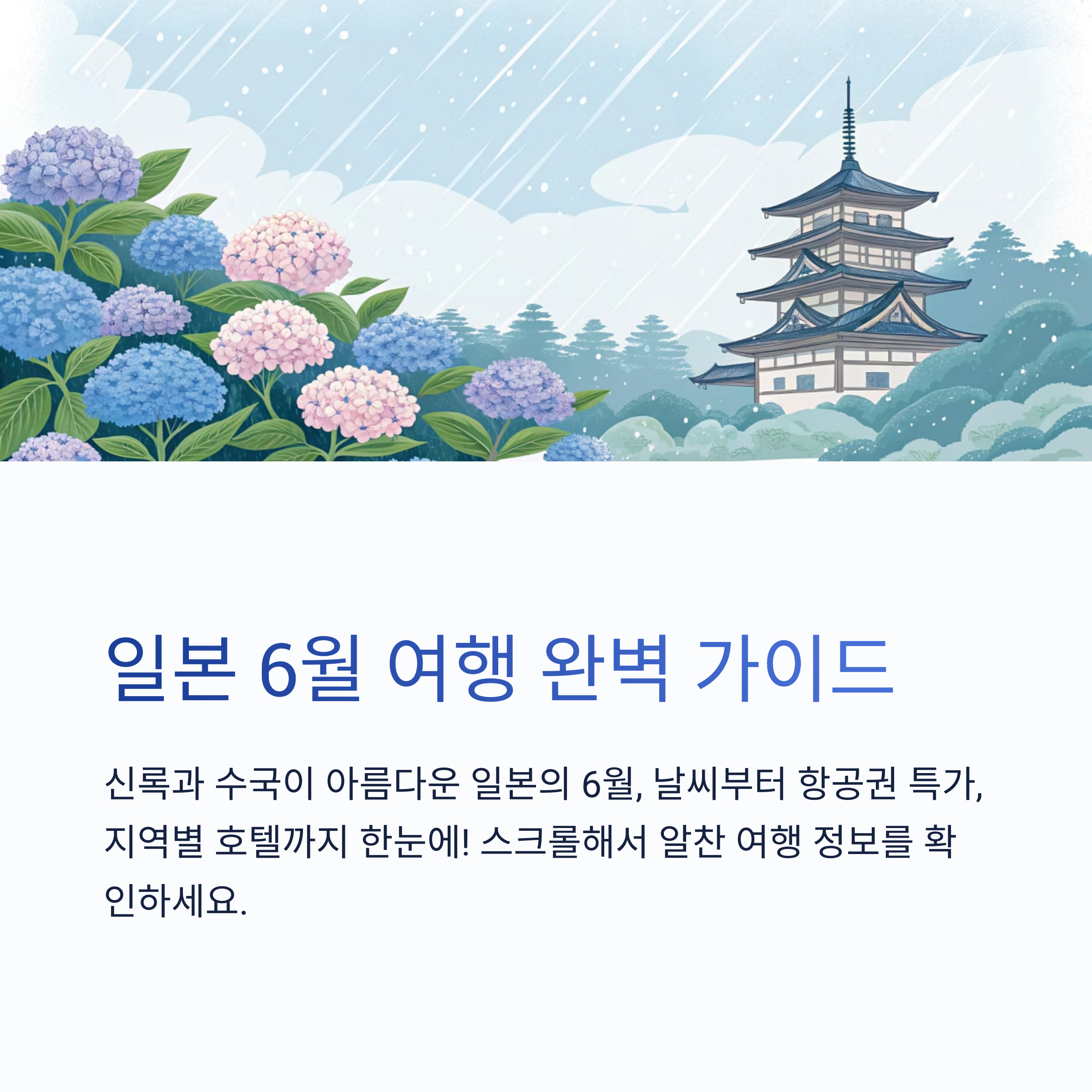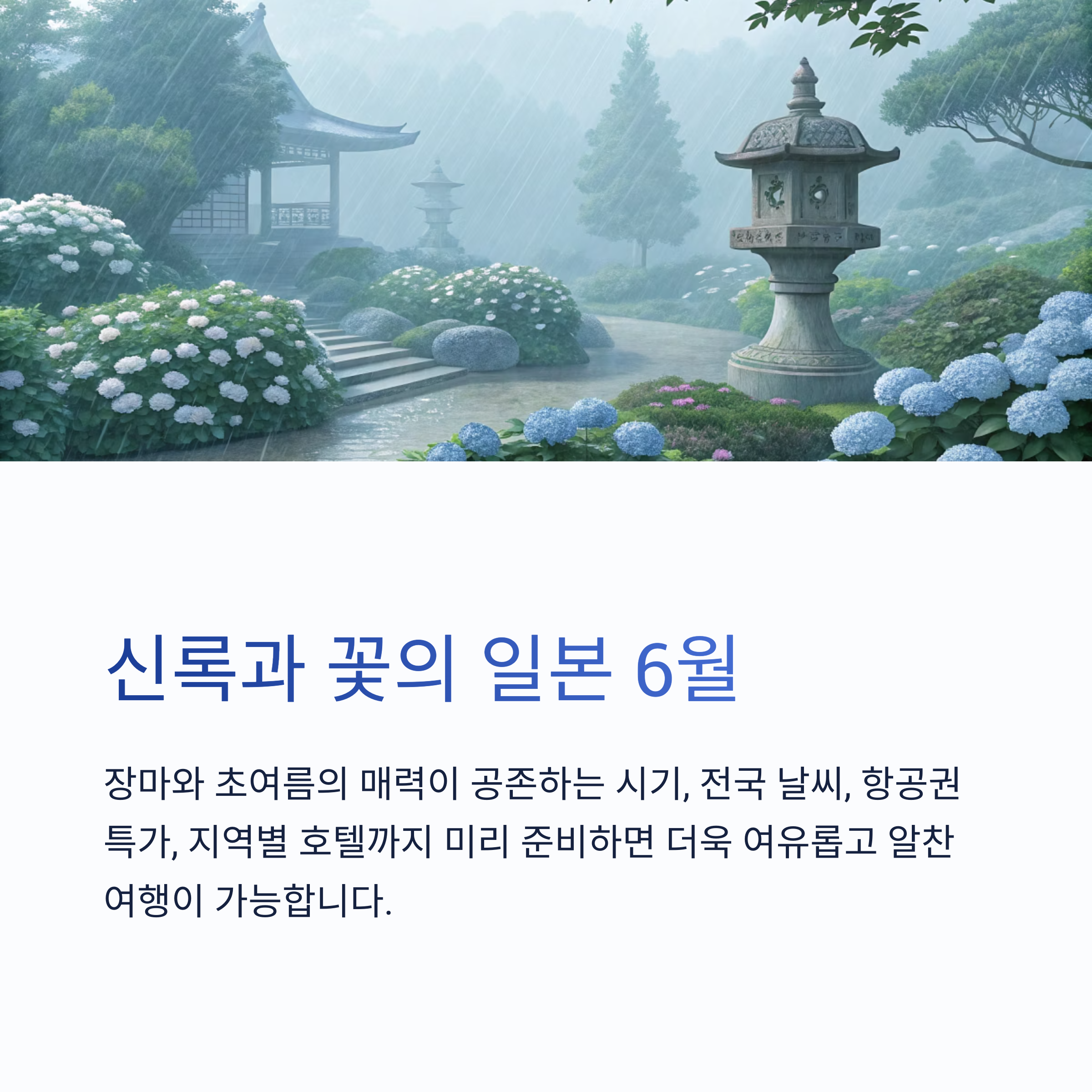 6월의 일본은 신록과 수국, 장마와 초여름의 활기가 공존하는 계절입니다. 여행 전 꼭 알아야 할 일본 6월 전국 날씨와 항공권 특가 정보, 도쿄·오사카·교토·후쿠오카 등 지역별 호텔 가이드를 한눈에 정리했습니다. 실전 여행 준비에 바로 도움이 되는 최신 정보를 꼼꼼하게 안내합니다.