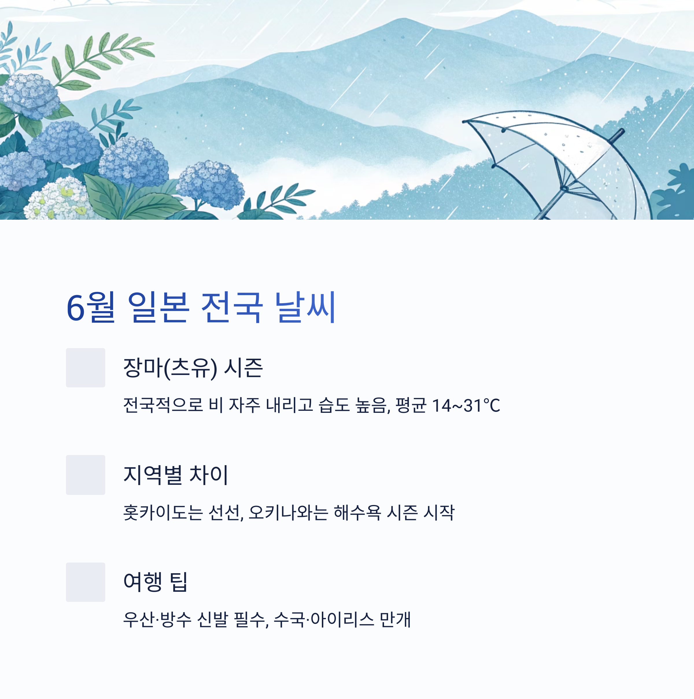 2025년 6월 일본은 장마와 초여름의 매력이 공존하는 시기입니다. 전국 날씨, 항공권 특가, 지역별 호텔까지 미리 준비하면 더욱 여유롭고 알찬 여행이 가능합니다. 공식 정보와 예약 사이트는 본문 내 버튼을 통해 확인하고, 완벽한 일본 여름 여행을 계획해보세요!