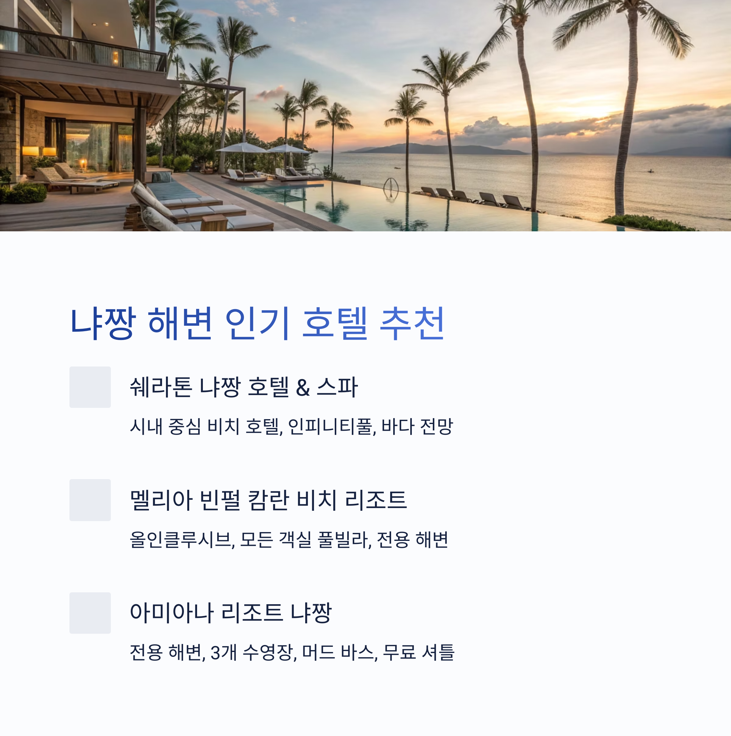 냐짱은 해변을 따라 고급 리조트, 가성비 호텔, 풀빌라 등 다양한 숙소가 밀집해 있습니다. 해변 접근성, 전망, 부대시설, 후기 모두 좋은 인기 호텔과 리조트를 소개합니다.