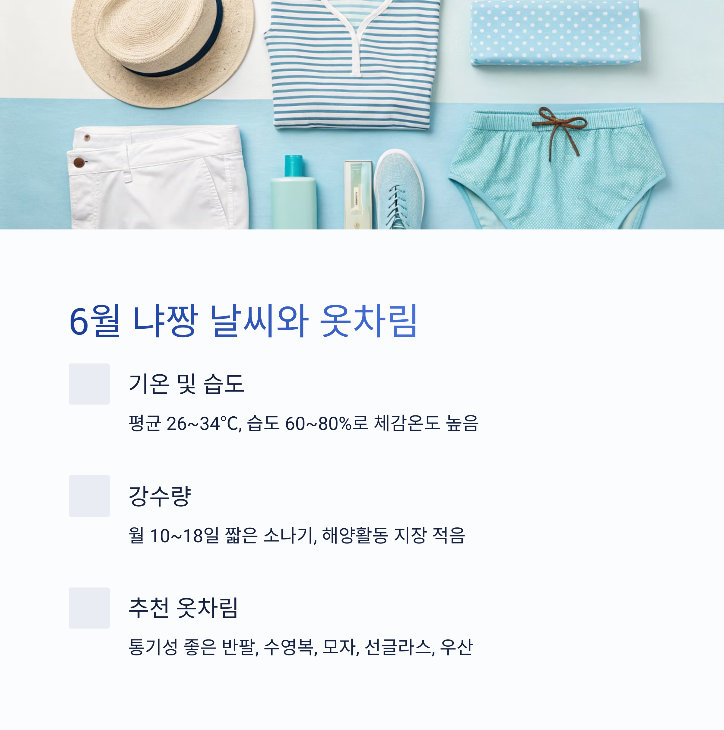 추천 옷차림: 통기성 좋은 반팔, 반바지, 원피스, 린넨 셔츠, 샌들, 모자, 선글라스, 자외선 차단제, 수영복, 얇은 겉옷(실내 냉방 대비), 작은 우산 또는 우비.