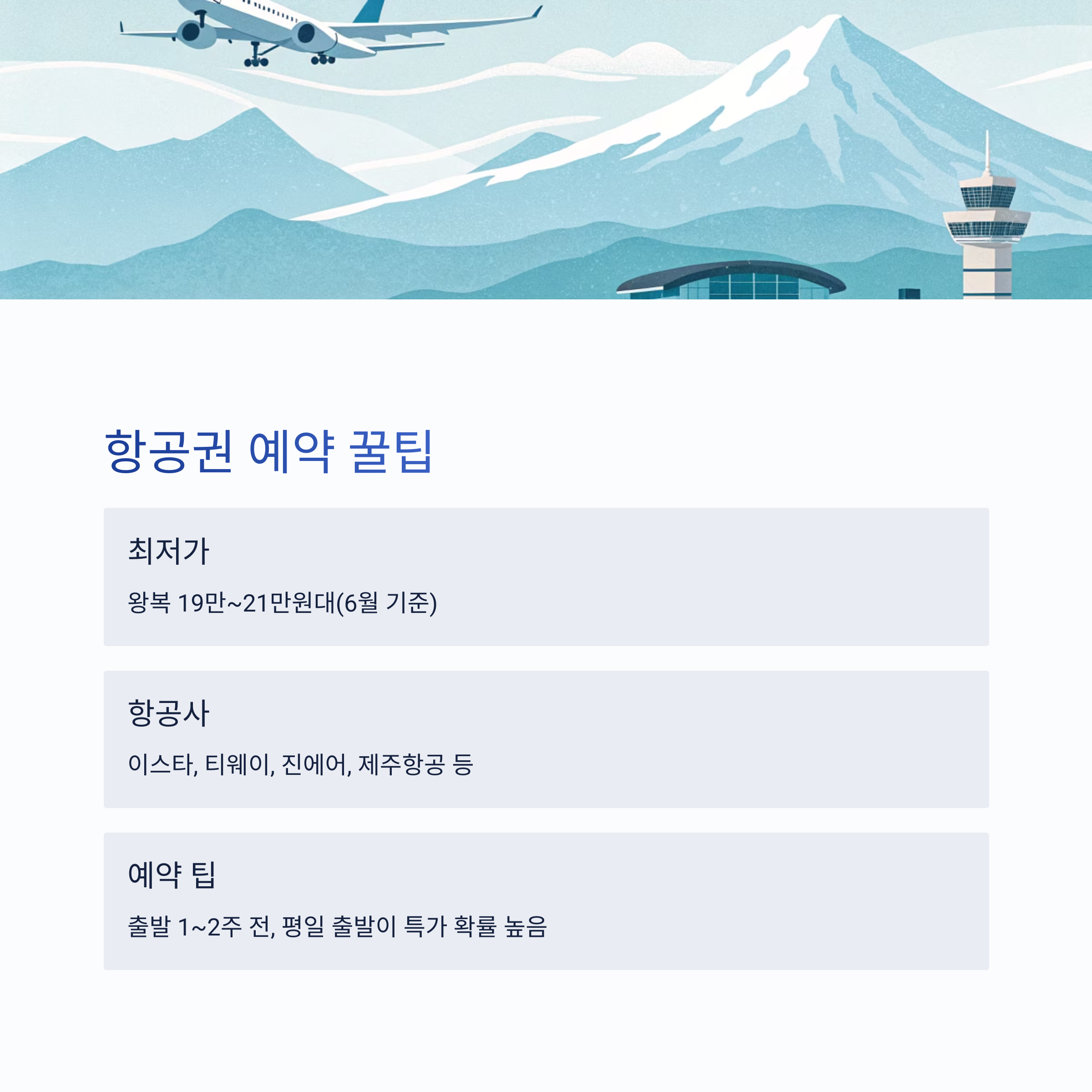 - 항공권 예약 팁: 출발 1~2주 전이 가장 저렴, 평일·화요일·수요일 출발이 특가 확률 높음