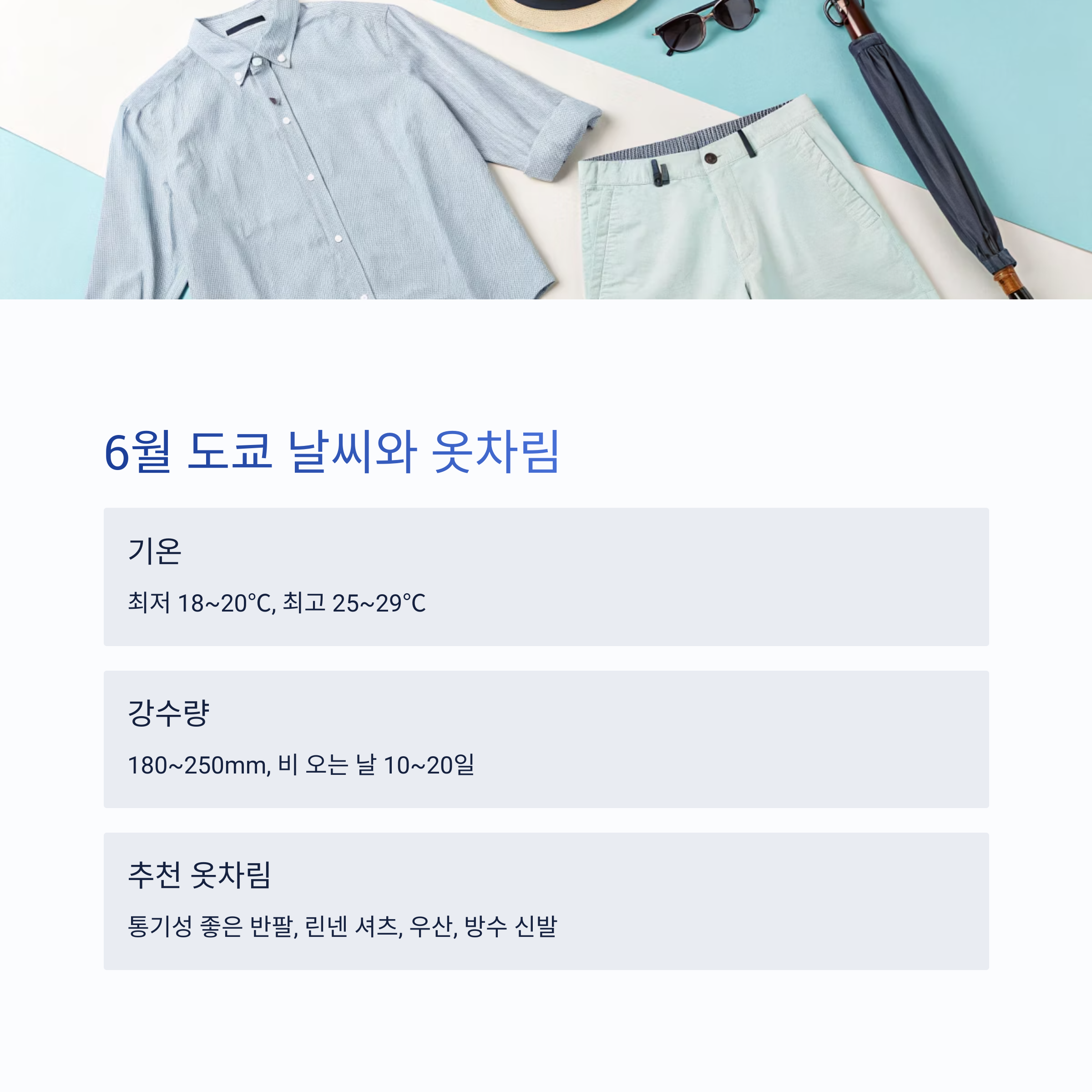 여행 팁: 장마철에는 비가 자주 오니 실내 관광, 쇼핑, 맛집 탐방 일정을 늘리고, 실시간 예보를 참고해 일정에 유연성을 두세요. 비 오는 날의 도쿄는 네온사인과 어우러져 또 다른 매력을 선사합니다.