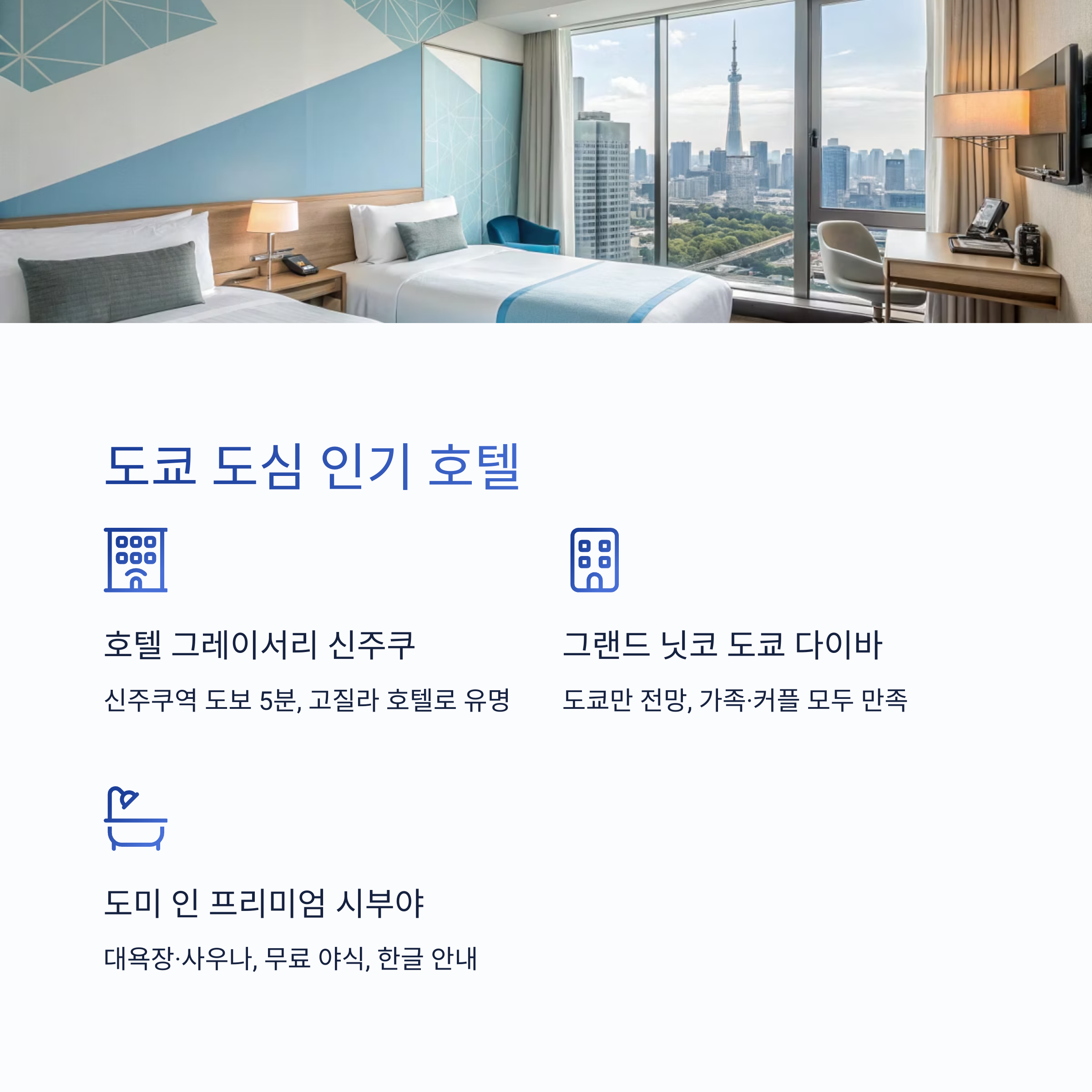 도쿄는 신주쿠, 시부야, 긴자, 도쿄역, 오다이바 등 교통·쇼핑·관광 모두 편리한 중심가에 다양한 호텔이 밀집해 있습니다. 최근 후기와 위치, 시설, 가성비 모두 좋은 인기 호텔을 소개합니다.