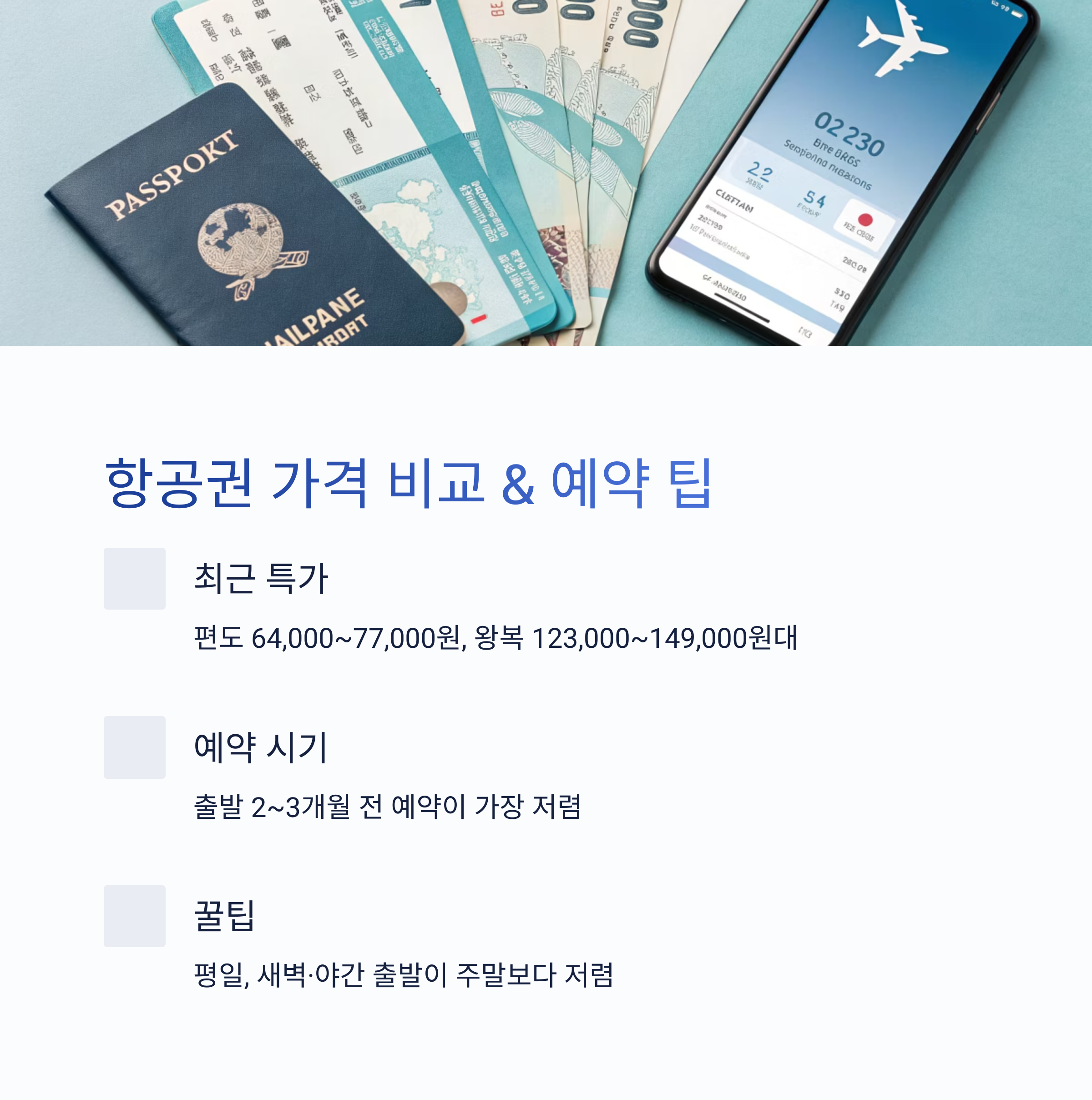 - 출발 2~3개월 전 예약이 가장 저렴합니다. (6월~11월이 비수기, 3~4월 벚꽃·10~11월 단풍철은 성수기)