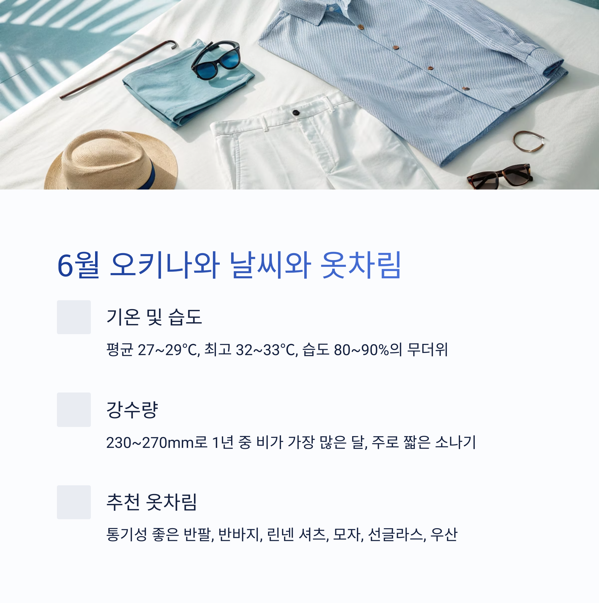 6월의 오키나와는 무더위와 장마, 태풍 가능성이 있지만, 해수욕·해양 스포츠·리조트 휴양을 합리적인 가격에 즐길 수 있는 시기입니다. 비와 더위, 기상 변수에 대비한 옷차림과 준비물만 챙기면, 가족 모두 만족할 만한 여름 여행이 가능합니다. 실시간 날씨와 항공권, 호텔 가격을 꼭 확인하고 오키나와에서 잊지 못할 추억을 만들어보세요!
