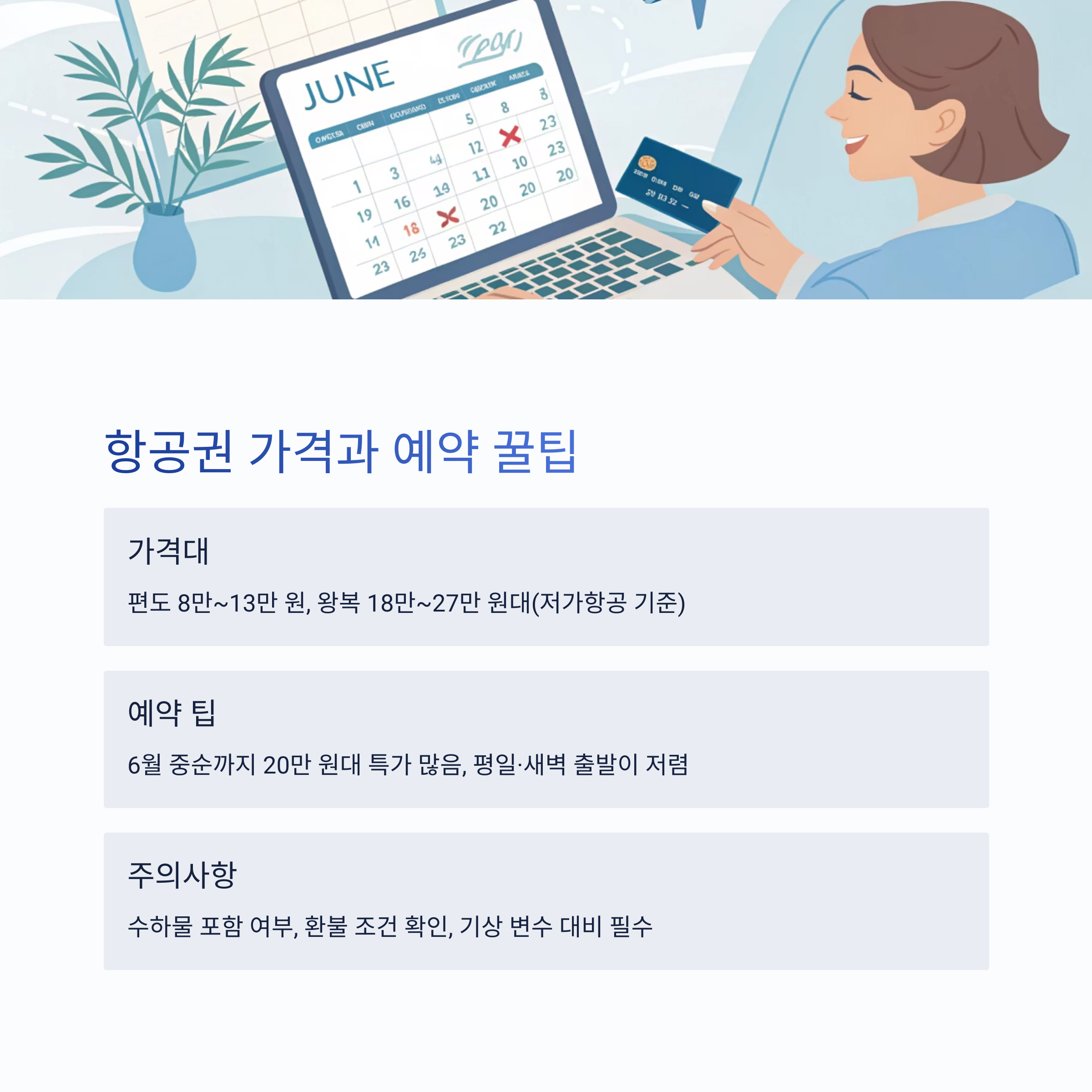 - 6월 중순까지는 20만 원대 왕복 특가가 많으니, 미리 예약하면 저렴하게 다녀올 수 있습니다.