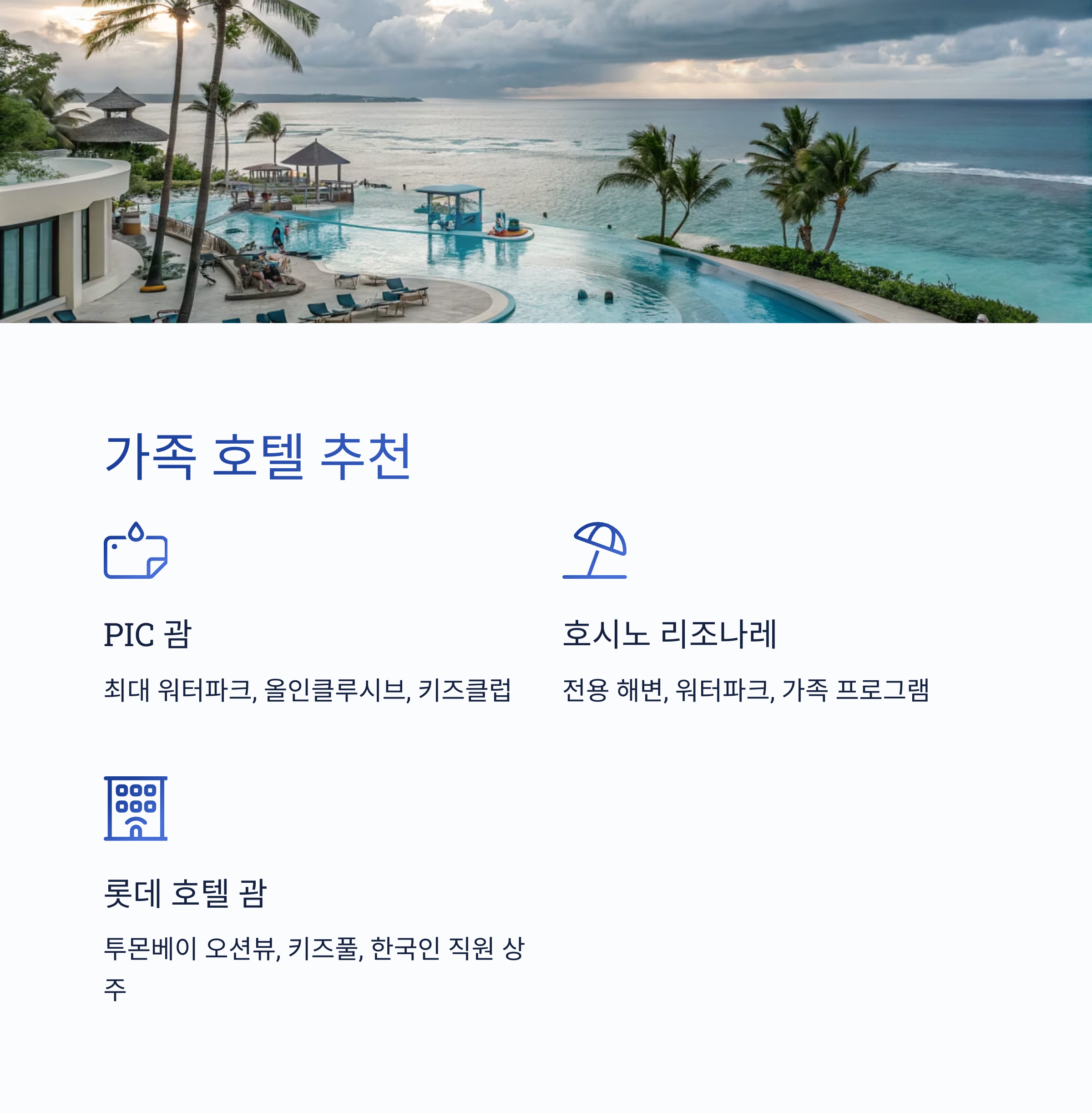 괌은 투몬베이, 타무닝 등 해변을 따라 가족 친화적인 리조트와 호텔이 밀집해 있습니다. 넓은 객실, 다양한 수영장, 키즈클럽, 해변 접근성, 조식 등 부대시설이 잘 갖춰진 인기 숙소를 소개합니다.