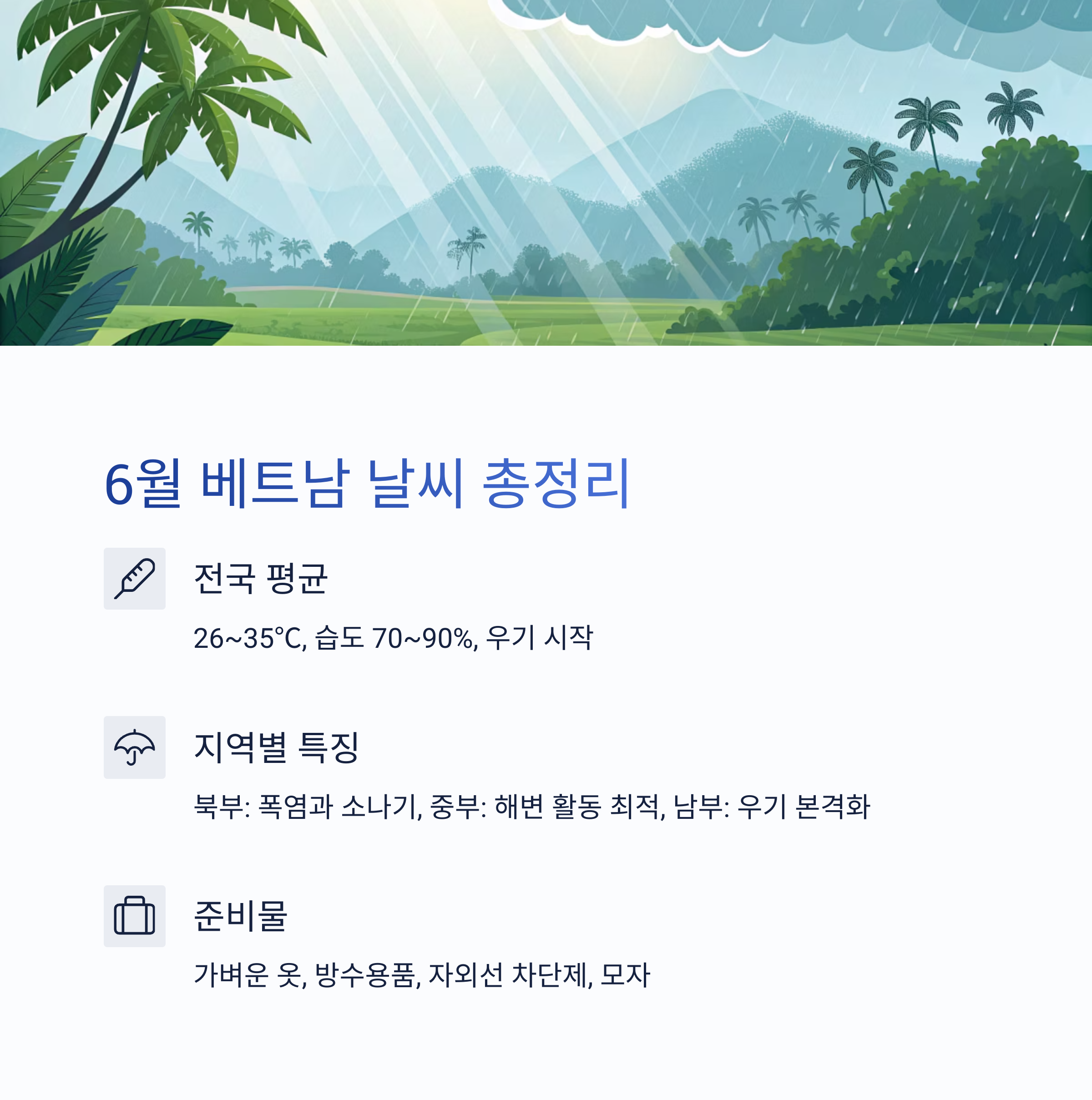 베트남은 남북으로 길게 뻗은 지형 특성상 지역별로 날씨 차이가 큽니다. 6월은 전국적으로 평균 26~35℃, 습도 70~90%로 덥고 습한 여름철입니다. 전국적으로 우기가 시작되며, 소나기와 뇌우가 자주 내리지만 해가 뜨는 시간도 많아 해변과 야외활동을 즐기기에 무리가 없습니다.