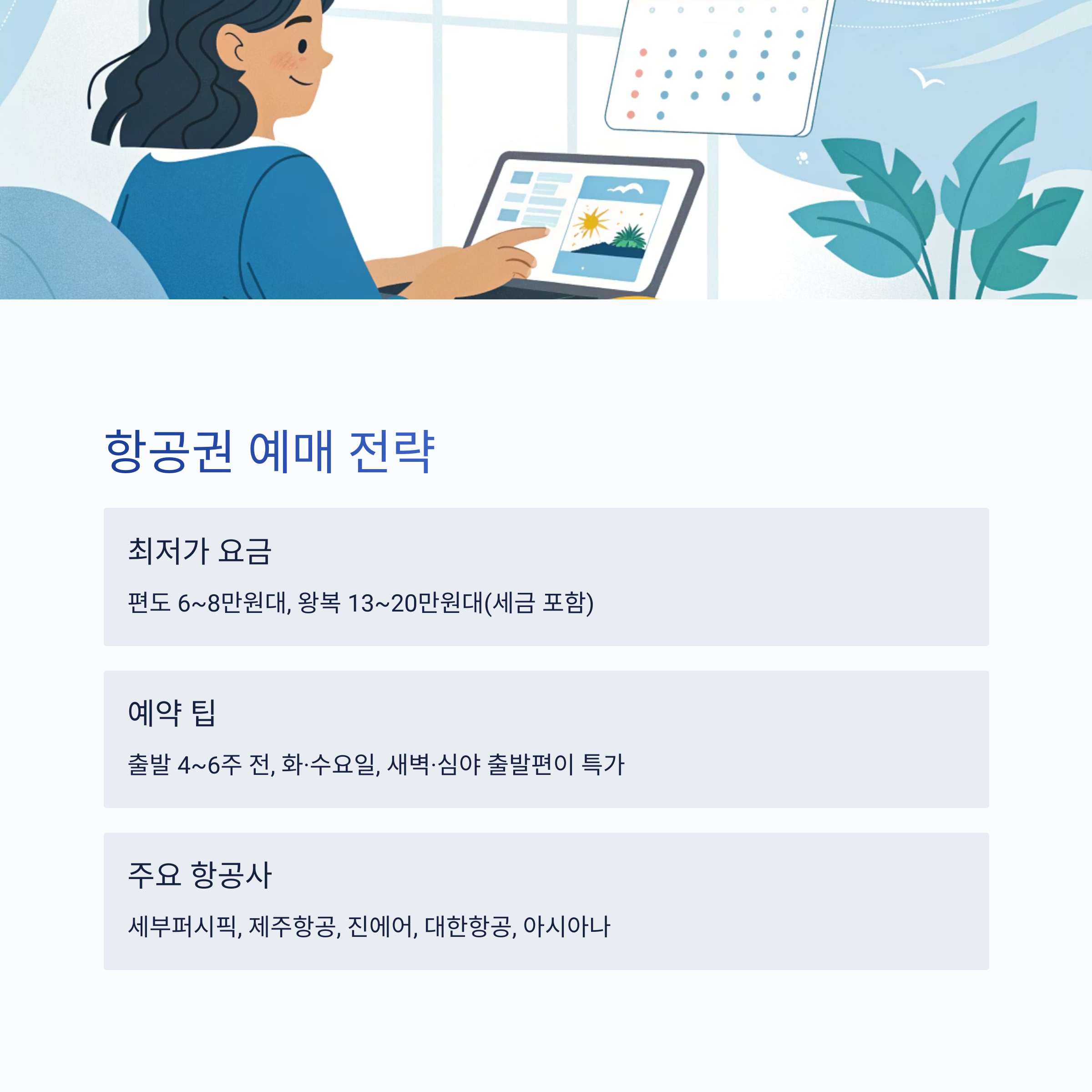 - 항공권은 4~6주 전, 평일·심야 특가 노리기