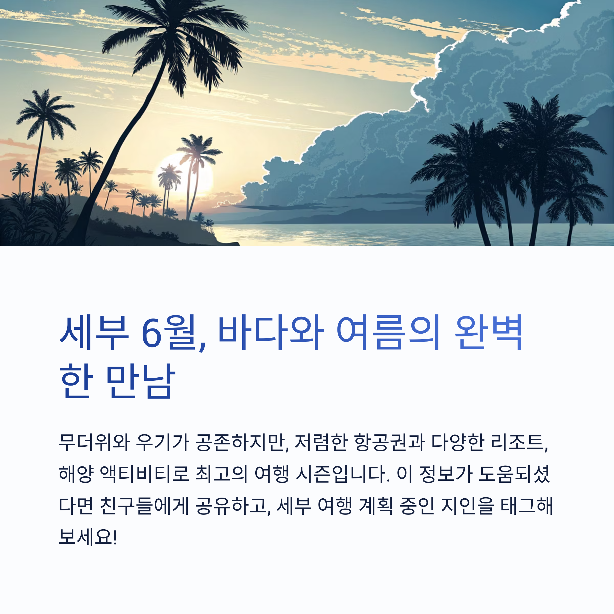 필리핀 최고의 휴양지 세부는 6월이면 본격적인 여름과 함께 우기가 시작되는 시기입니다. 여행 전 꼭 알아야 할 세부 6월 날씨, 항공권 예매 전략, 막탄·세부시티 리조트 호텔 베스트를 한눈에 정리했습니다. 실전 여행 준비에 바로 도움이 되는 최신 정보를 꼼꼼하게 안내합니다.
