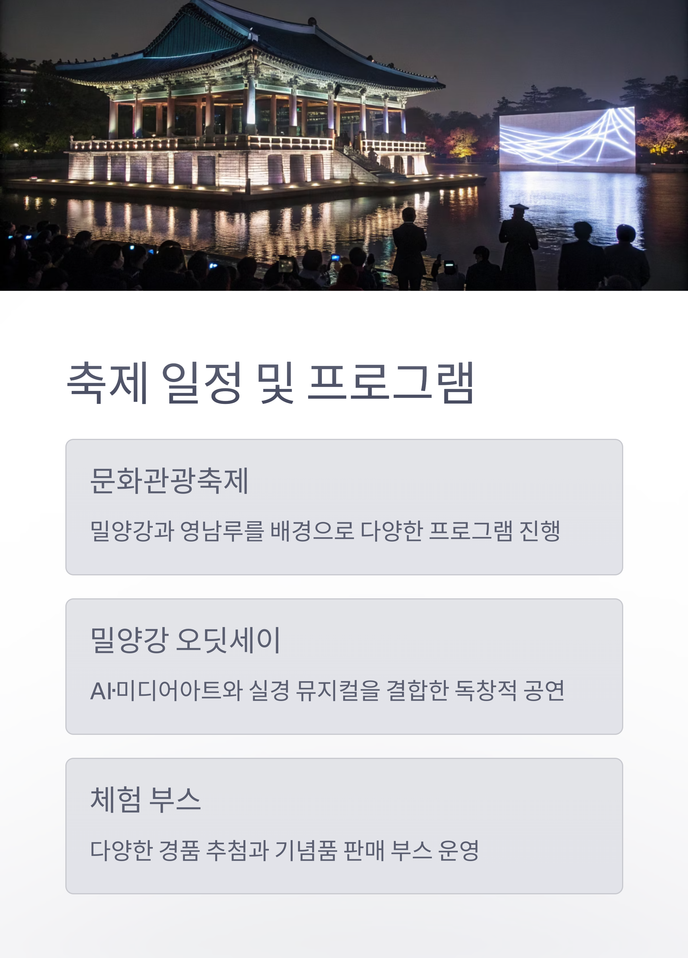 한 해를 대표하는 문화관광축제로, 밀양강과 영남루를 배경으로 펼쳐지는 다양한 프로그램이 준비되어 있습니다.