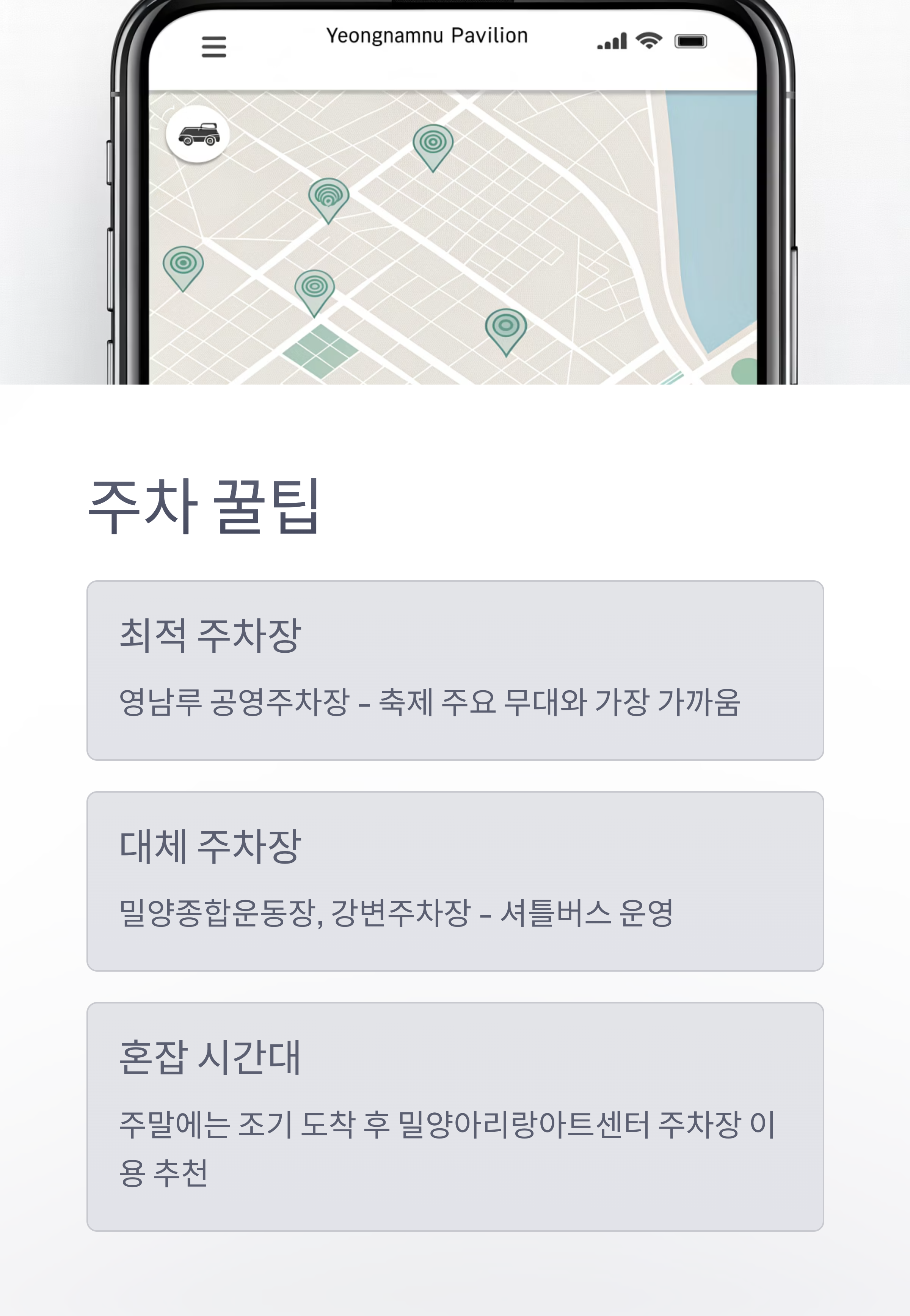 | 행사장과 가장 가까운 주차공간은 영남루 공영주차장입니다. 영남루 공영주차장은 축제 주요 무대와 인접하여 이동 거리가 짧아 가장 편리합니다. 추가적으로 밀양종합운동장 및 강변주차장도 이용 가능하며, 이곳에는 셔틀버스가 운영됩니다. 만약 주말 등 붐비는 시간대라면 조기 도착 후 밀양아리랑아트센터 주차장을 이용하는 것도 추천됩니다. 축제 공식 홈페이지와 구글맵을 통해 실시간 안내를 확인하는 것이 혼잡을 줄이는 데 유용합니다. |