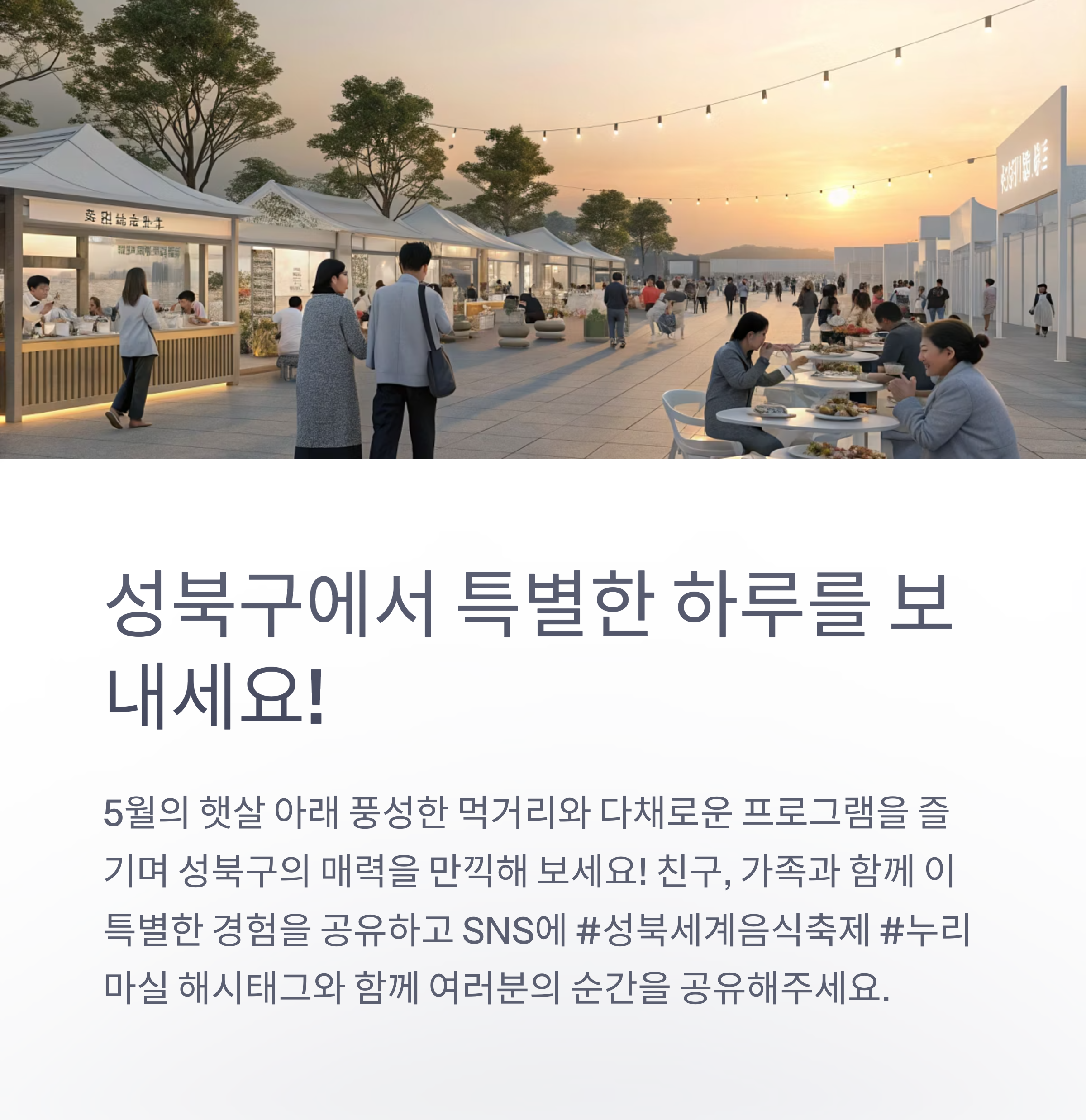 5월의 햇살 아래 풍성한 먹거리와 다채로운 프로그램을 즐기며 성북구의 매력을 만끽해 보세요!