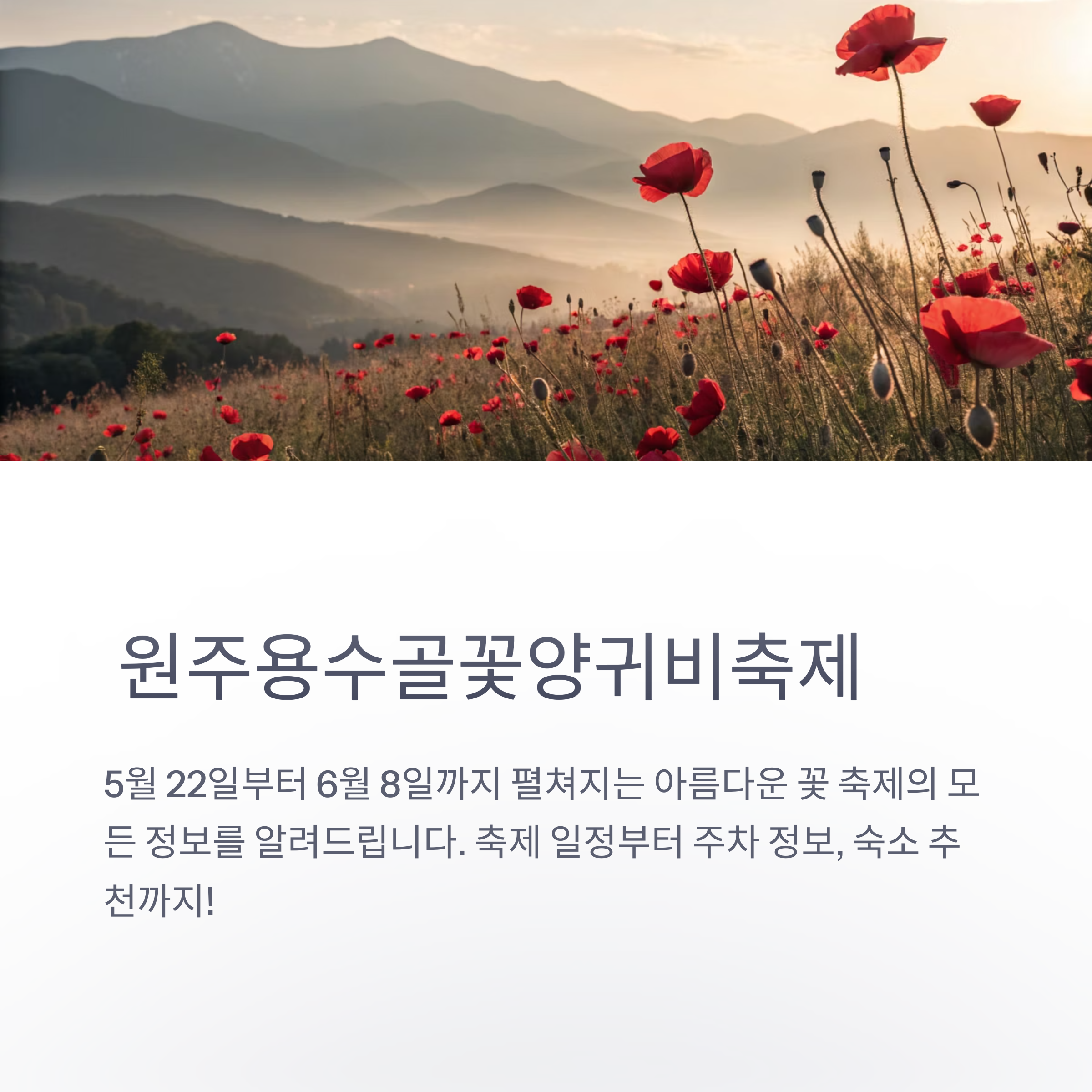 안녕하세요, 오늘은 원주용수골꽃양귀비축제에 대해 알아보는 시간을 준비했습니다.