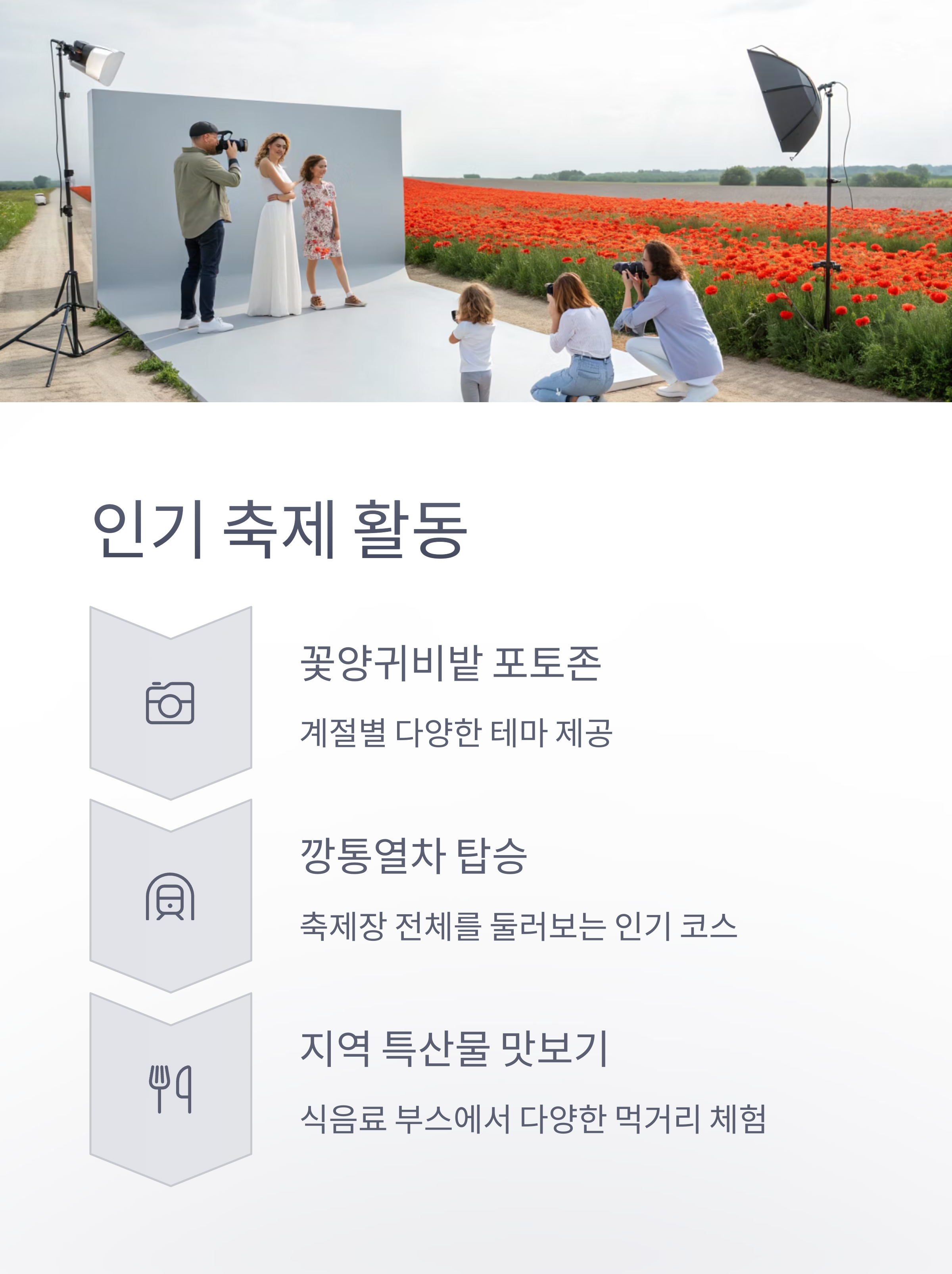 꽃양귀비밭 포토존에서는 계절에 따라 다양한 테마가 제공되어, 방문객들에게 독특한 추억을 선사합니다.