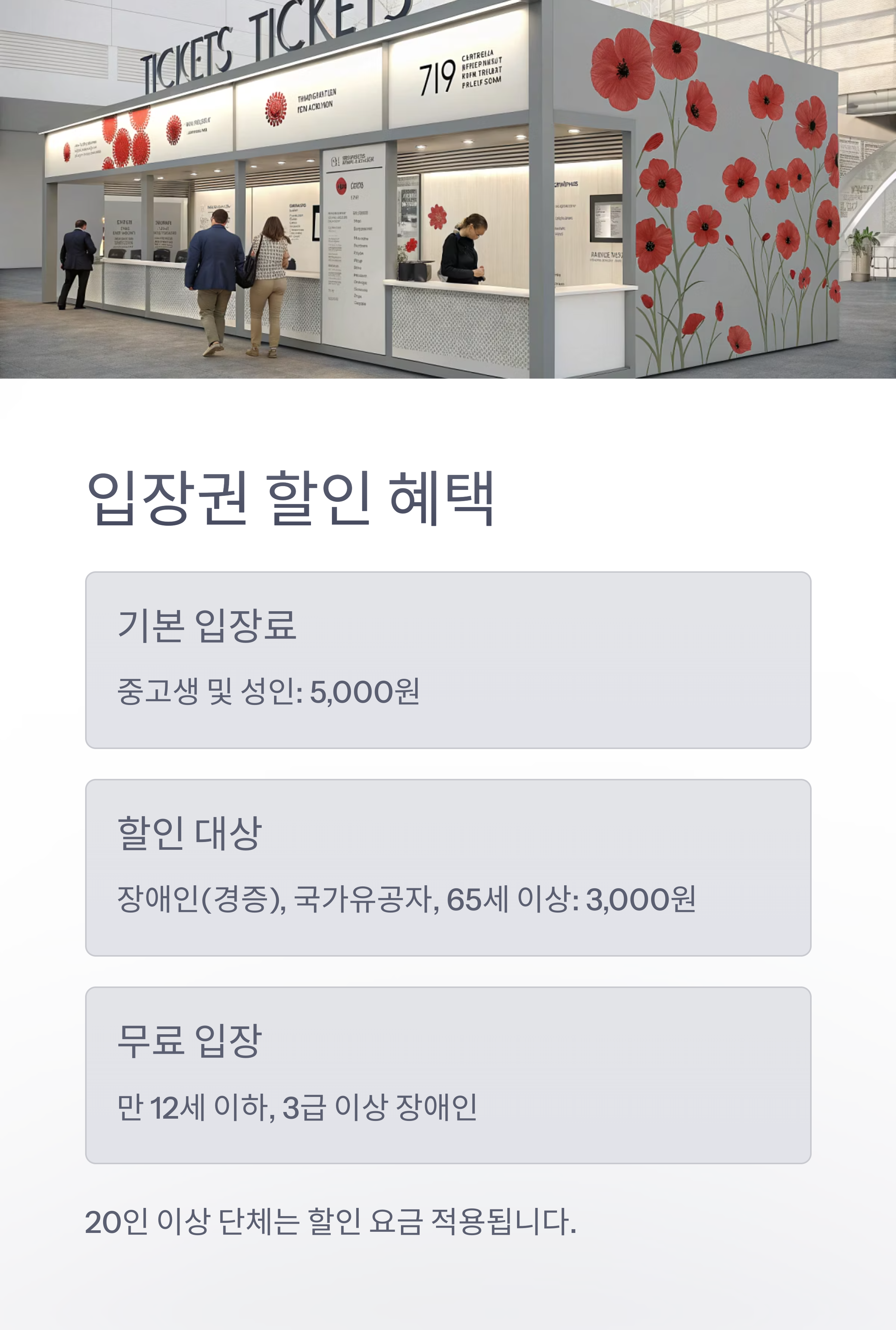 입장료는 중고생 및 성인 기준 5,000원이며, 65세 이상 어르신, 장애인, 국가유공자는 3,000원의 할인을 받을 수 있습니다.
