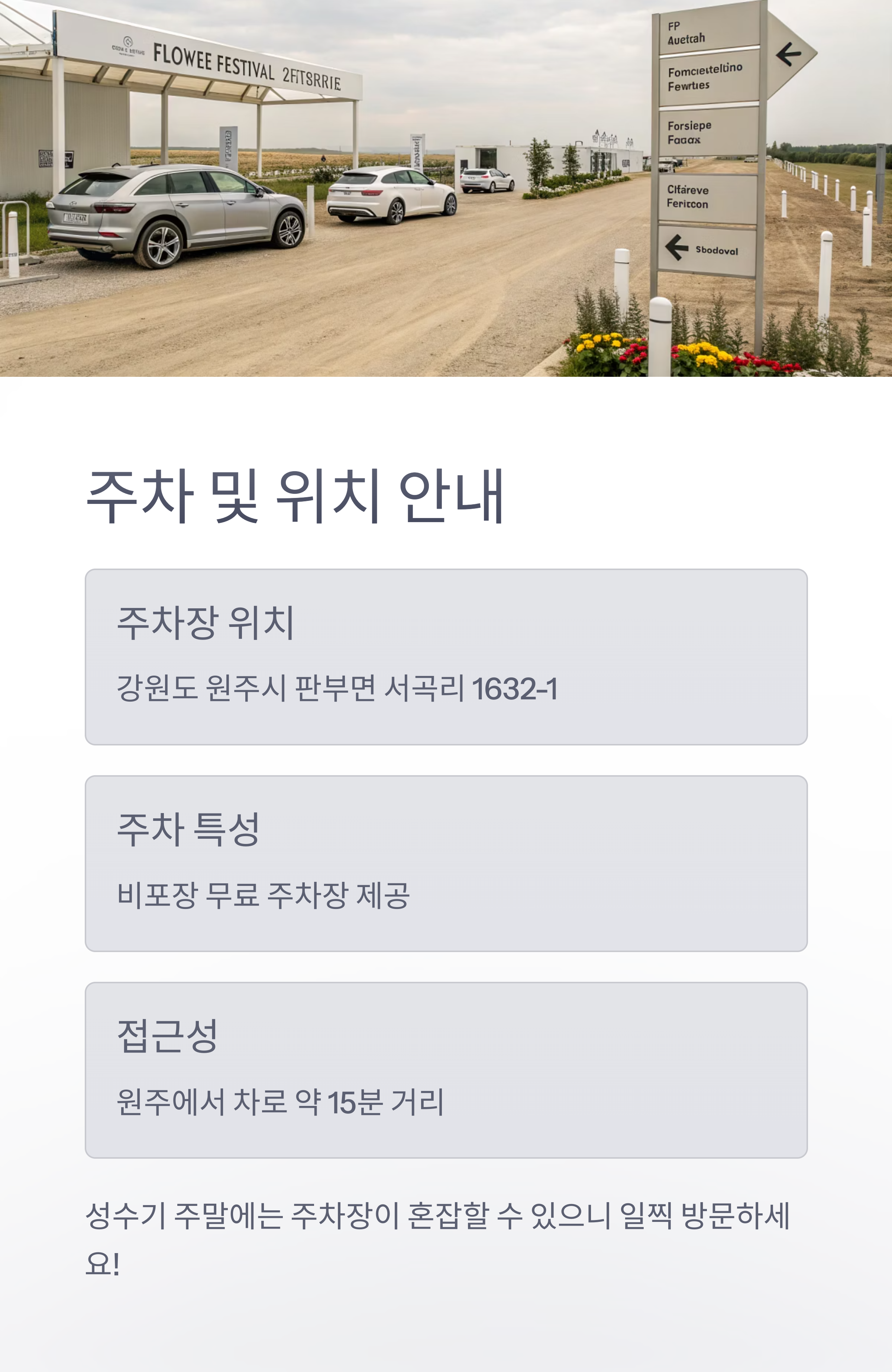 꽃양귀비마을 축제장은 원주에서 차로 약 15분 거리에 위치하며, 바로 앞에 넓은 비포장 무료 주차장이 마련되어 있습니다.